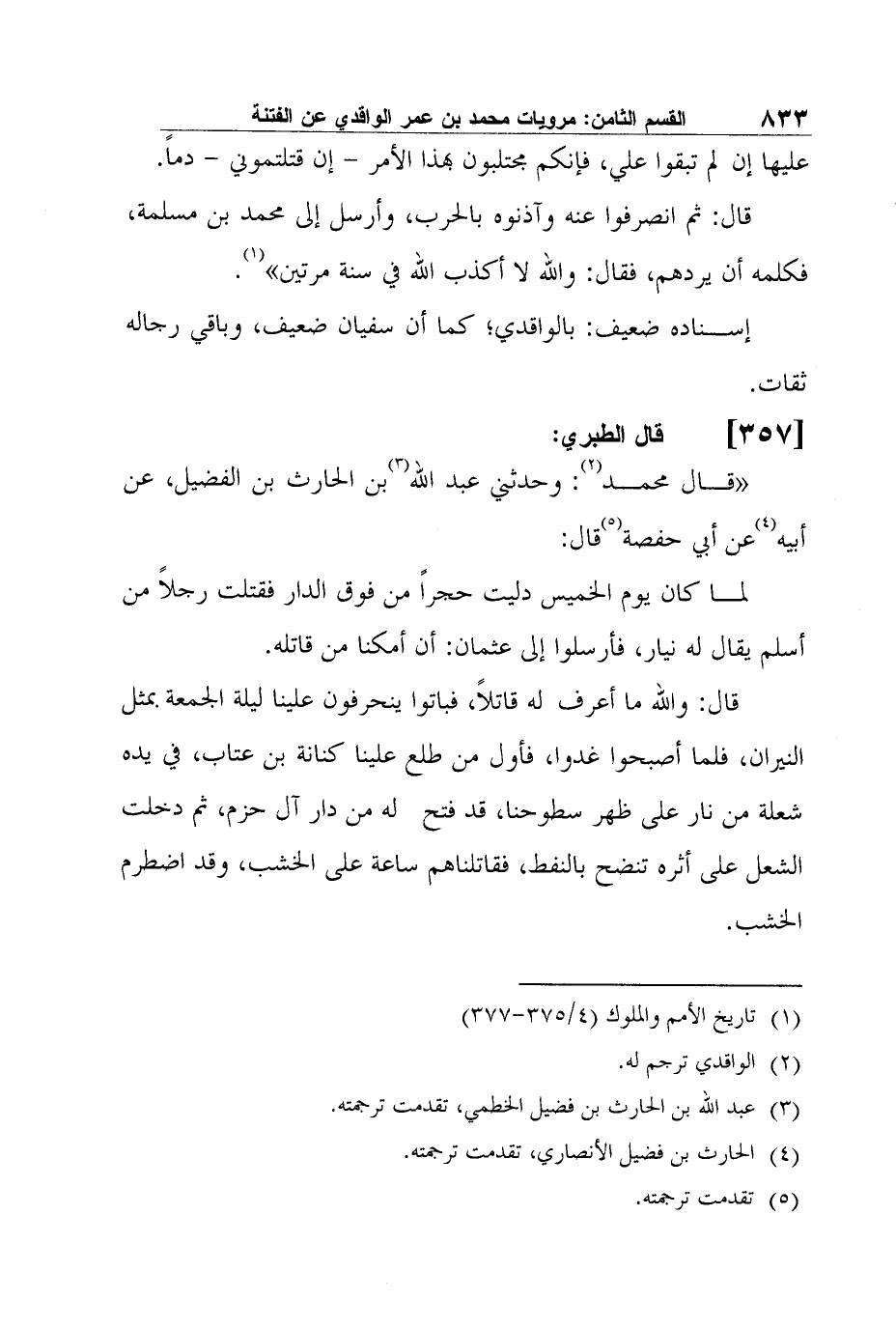 30- قال الطبري: "قال محمد2: وحدثني عبد الله3 بن الحارث بن الفضيل، عن أبيه4 عن أبي حفصة5 قال: لما كان يوم الخميس دليت حجراً من فوق الدار فقتلت رجلاً من أسلم يقال له نيار، فأرسلوا إلى عثمان: أن أمكنا من قاتله. قال: والله ما أعرف له قاتلاً، فباتوا ينحرفون علينا ليلة الجمعة بمثل النيران، فلما أصبحوا غدوا، فأول من طلع علينا كنانة بن عتاب، في يده شعلة من نار على ظهر سطوحنا، قد فتح له من دار آل حزم، ثم دخلت الشعل على أثره تنضح بالنفط، فقاتلناهم ساعة على الخشب، وقد اضطرم الخشب.