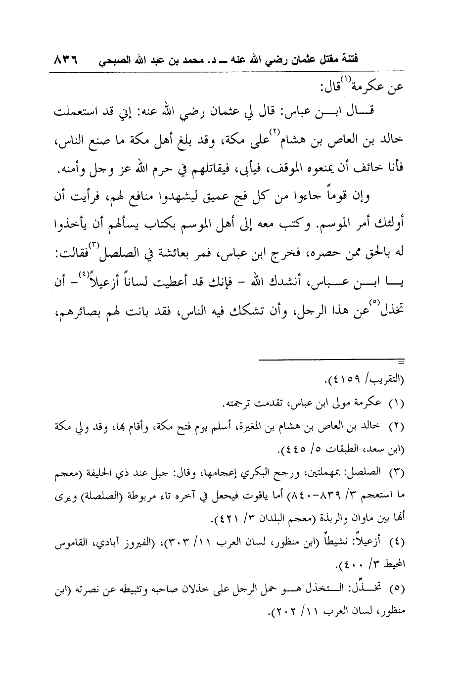 عن عكرمة1 قال: قال ابن عباس: قال لي عثمان رضي الله عنه: إني قد استعملت خالد بن العاص بن هشام2على مكة، وقد بلغ أهل مكة ما صنع الناس، فأنا خائف أن يمنعوه الموقف، فيأبى، فيقاتلهم في حرم الله عز وجل وأمنه. وإن قوماً جاءوا من كل فج عميق ليشهدوا منافع لهم، فرأيت أن أوليك أمر الموسم. وكتب معه إلى أهل الموسم بكتاب يسألهم أن يأخذوا له بالحق ممن حصره، فخرج ابن عباس، فمر بعائشة في الصلصل3 فقالت: يا ابن عباس، أنشدك الله - فإنك قد أعطيت لساناً أزعيلاً4- أن تخذل5 عن هذا الرجل، وأن تشكك فيه الناس، فقد بانت لهم بصائرهم،