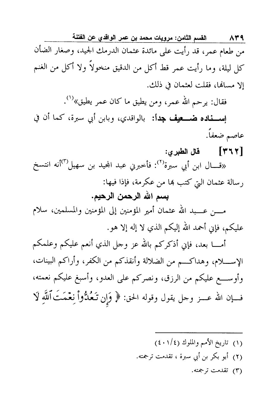 35- قال الطبري: "قال ابن أبي سبرة2: فأخبرني عبد المجيد بن سهيل3 أنه انتسخ رسالة عثمان التي كتب بها من عكرمة، فإذا فيها: