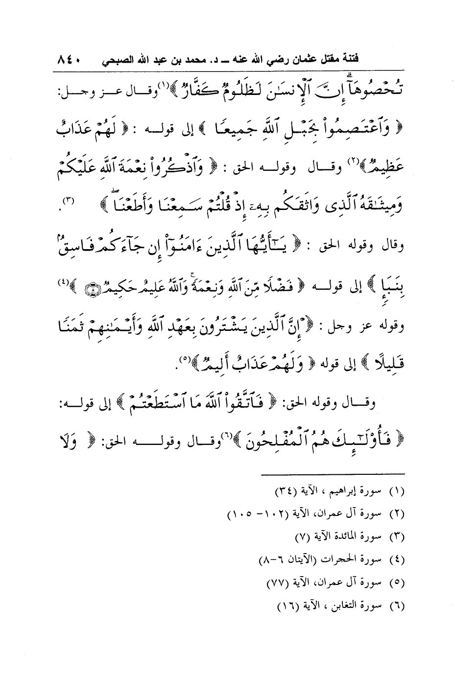 تُحْصُوهَا إِنَّ الْأِنْسَانَ لَظَلُومٌ كَفَّارٌ} 1, وقال عز وجل: {وَاعْتَصِمُوا بِحَبْلِ اللَّهِ جَمِيعاً} إلى قوله: {وَلَهُمْ عَذَابٌ عَظِيمٌ} 2. وقال وقوله الحق: {وَاذْكُرُوا نِعْمَةَ اللَّهِ عَلَيْكُمْ وَمِيثَاقَهُ الَّذِي وَاثَقَكُمْ بِهِ إِذْ قُلْتُمْ سَمِعْنَا وَأَطَعْنَا} 3. وقال وقوله الحق: {يَا أَيُّهَا الَّذِينَ آمَنُوا إِنْ جَاءَكُمْ فَاسِقٌ بِنَبَأٍ} إلى قوله {فَضْلاً مِنَ اللَّهِ وَنِعْمَةً وَاللَّهُ عَلِيمٌ حَكِيمٌ} 4 وقوله عز وجل: {إِنَّ الَّذِينَ يَشْتَرُونَ بِعَهْدِ اللَّهِ وَأَيْمَانِهِمْ ثَمَناً قَلِيلاً} إلى قوله {وَلَهُمْ عَذَابٌ أَلِيمٌ} 5.وقال وقوله الحق: {فَاتَّقُوا اللَّهَ مَا اسْتَطَعْتُمْ} إلى قوله: {فَأُولَئِكَ هُمُ الْمُفْلِحُونَ} 6 وقال وقوله الحق: {وَلا