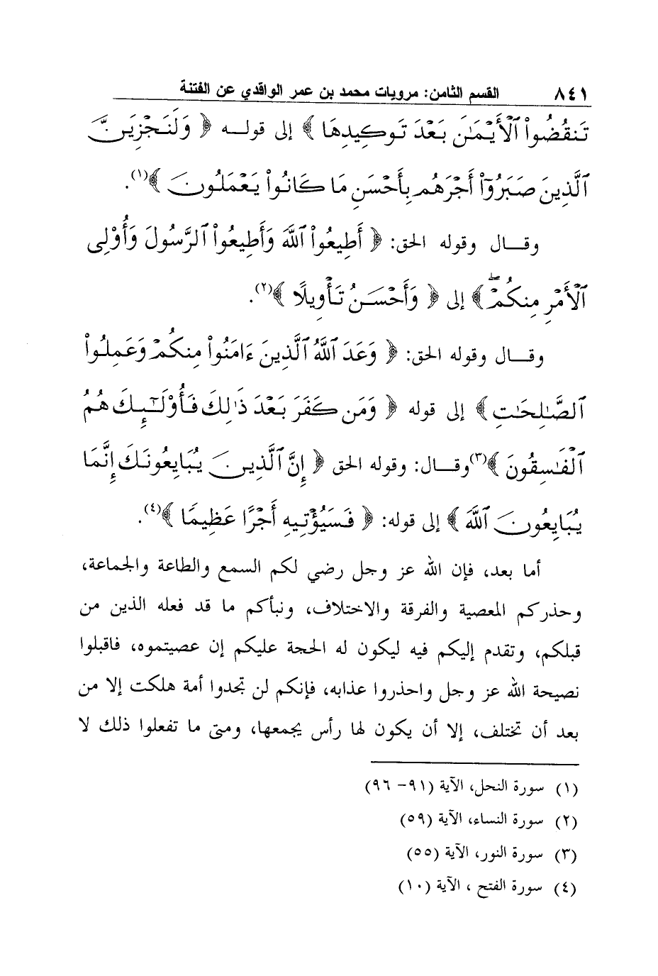 تَنْقُضُوا الْأَيْمَانَ بَعْدَ تَوْكِيدِهَا} إلى قوله {وَلَنَجْزِيَنَّ الَّذِينَ صَبَرُوا أَجْرَهُمْ بِأَحْسَنِ مَا كَانُوا يَعْمَلُونَ} 1. وقال وقوله الحق: {أَطِيعُوا اللَّهَ وَأَطِيعُوا الرَّسُولَ وَأُولِي الْأَمْرِ مِنْكُمْ} إلى {وَأَحْسَنُ تَأْوِيلاً} 2 وقال: وقوله الحق {وَعَدَ اللَّهُ الَّذِينَ آمَنُوا مِنْكُمْ وَعَمِلُوا الصَّالِحَاتِ} إلى قوله {وَمَنْ كَفَرَ بَعْدَ ذَلِكَ فَأُولَئِكَ هُمُ الْفَاسِقُونَ} 3 وقال: وقوله الحق {إِنَّ الَّذِينَ يُبَايِعُونَكَ إِنَّمَا يُبَايِعُونَ اللَّهَ} إلى قوله: {فَسَيُؤْتِيهِ أَجْراً عَظِيماً} 4.
