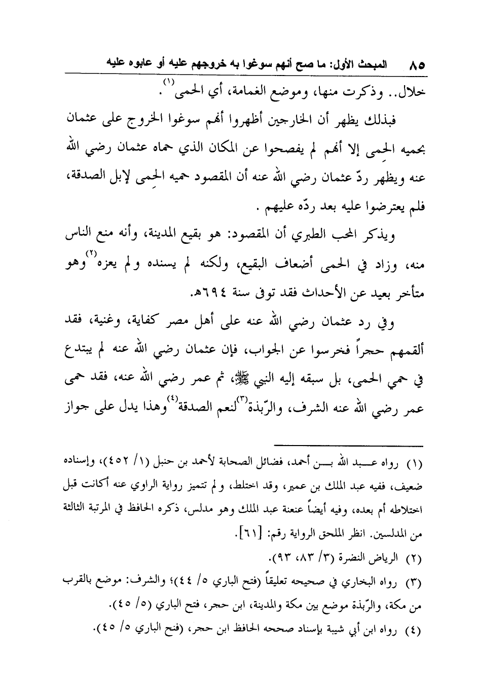 وفي رد عثمان رضي الله عنه على أهل مصر كفاية، وغنية، فقد ألقمهم حجراً فخرسوا عن الجواب، فإن عثمان رضي الله عنه لم يبتدع في حمي الحمى، بل سبقه إليه النبي صلى الله عليه وسلم، ثم عمر رضي الله عنه، فقد حمى عمر رضي الله عنه الشرف، والرّبذة3 لنعم الصدقة4 وهذا يدل على جواز