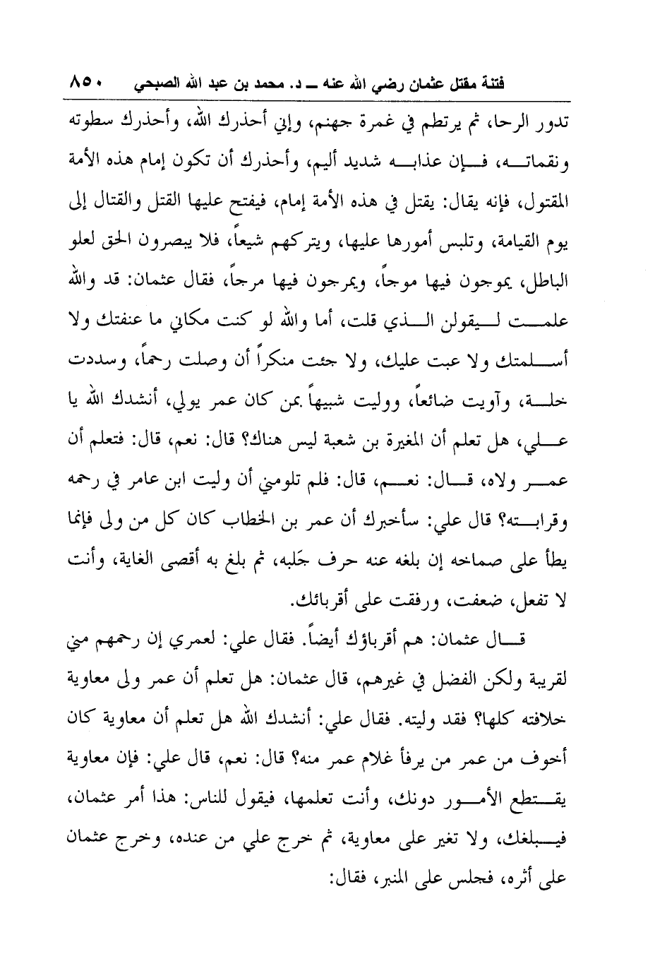 تدور الرحا، ثم يرتطم في غمرة جهنم، وإني أحذرك الله، وأحذرك سطوته ونقماته، فإن عذابه شديد أليم، وأحذرك أن تكون إمام هذه الأمة المقتول، فإنه يقال: يقتل في هذه الأمة إمام، فيفتح عليها القتل والقتال إلى يوم القيامة، وتلبس أمورها عليها، ويتركهم شيعاً، فلا يبصرون الحق لعلو الباطل، يموجون فيها موجاً، ويمرجون فيها مرجاً، فقال عثمان: قد والله علمت ليقولن الذي قلت، أما والله لو كنت مكاني ما عنفتك ولا أسلمتك ولا عبت عليك، ولا جئت منكراً أن وصلت رحماً، وسددت خلة، وآويت ضائعاً، ووليت شبيهاً بمن كان عمر يولي، أنشدك الله يا علي، هل تعلم أن المغيرة بن شعبة ليس هناك؟ قال: نعم، قال: فتعلم أن عمر ولاه، قال: نعم، قال: فلم تلومني أن وليت ابن عامر في رحمه وقرابته؟ قال علي: سأخبرك أن عمر بن الخطاب كان كل من ولى فإنما يطأ على صماخه إن بلغه عنه حرف جَلبه، ثم بلغ به أقصى الغاية، وأنت لا تفعل، ضعفت، ورفقت على أقربائك.