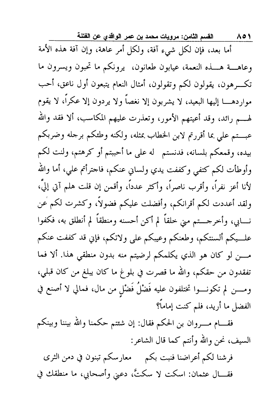 أما بعد، فإن لكل شيء آفة، ولكل أمر عاهة، وإن آفة هذه الأمة وعاهة هذه النعمة، عيابون طعانون، يرونكم ما تحبون ويسرون ما تكرهون، يقولون لكم وتقولون، أمثال النعام يتبعون أول ناعق، أحب مواردها إليها البعيد، لا يشربون إلا نغصاً ولا يردون إلا عكراً، لا يقوم لهم رائد، وقد أعيتهم الأمور، وتعذرت عليهم المكاسب، ألا فقد والله عبتم علي بما أقررتم لابن الخطاب بمثله، ولكنه وطئكم برجله وضربكم بيده، وقمعكم بلسانه، فدنستم له على ما أحببتم أو كرهتم، ولنت لكم وأوطأت لكم كتفي وكففت يدي ولساني عنكم، فاجترأتم علي، أما والله لأنا أعز نفراً، وأقرب ناصراً، وأكثر عدداً، وأقمن إن قلت هلم آتي إليَّ، ولقد أعددت لكم أقرانكم، وأفضلت عليكم فضولاً، وكشرت لكم عن نابي، وأخرجتم مني خلقاً لم أكن أحسنه ومنطقاً لم أنطلق به، فكفوا عليكم ألسنتكم، وطعنكم وعيبكم على ولاتكم، فإني قد كففت عنكم من لو كان هو الذي يكلمكم لرضيتم منه بدون منطقي هذا. ألا فما تفقدون من حقكم، والله ما قصرت في بلوغ ما كان يبلغ من كان قبلي، ومن لم تكونوا تختلفون عليه فَضْلُ فَضْلٍ من مال، فمالي لا أصنع في الفضل ما أريد، فلم كنت إماماً؟