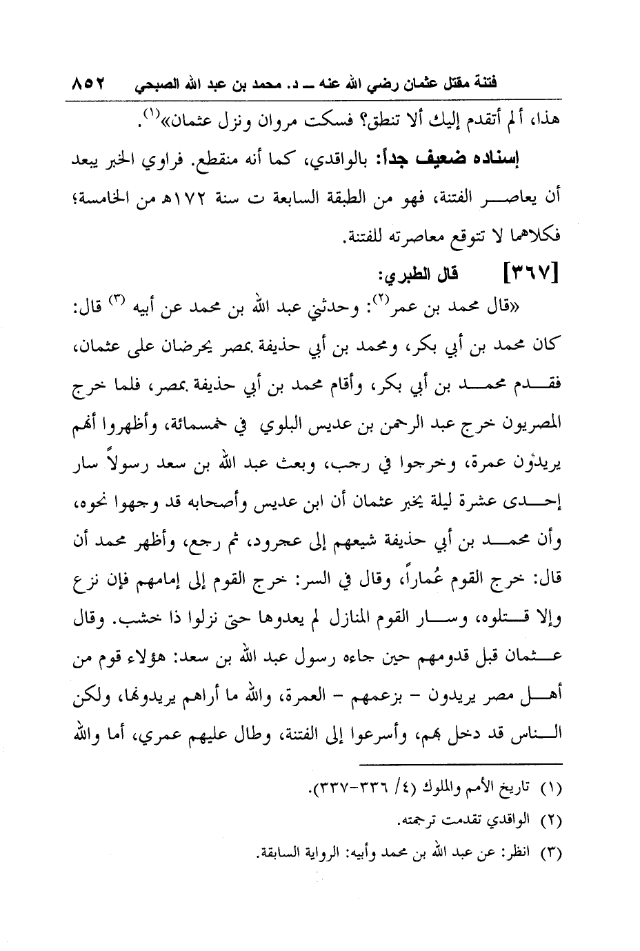 40- قال الطبري: "قال محمد بن عمر2: وحدثني عبد الله بن محمد عن أبيه3 قال: كان محمد بن أبي بكر، ومحمد بن أبي حذيفة بمصر يحرضان على عثمان، فقدم محمد بن أبي بكر، وأقام محمد بن أبي حذيفة بمصر، فلما خرج المصريون خرج عبد الرحمن بن عديس البلوي في خمسمائة، وأظهروا أنهم يريدون عمرة، وخرجوا في رجب، وبعث عبد الله بن سعد رسولاً سار إحدى عشرة ليلة يخبر عثمان أن ابن عديس وأصحابه قد وجهوا نحوه، وأن محمد بن أبي حذيفة شيعهم إلى عجرود، ثم رجع، وأظهر محمد أن قال: خرج القوم عُماراً، وقال في السر: خرج القوم إلى إمامهم فإن نزع وإلا قتلوه، وسار القوم المنازل لم يعدوها حتى نزلوا ذا خشب. وقال عثمان قبل قدومهم حين جاءه رسول عبد الله بن سعد: هؤلاء قوم من أهل مصر يريدون - بزعمهم - العمرة، والله ما أراهم يريدونها، ولكن الناس قد دخل بهم، وأسرعوا إلى الفتنة، وطال عليهم عمري، أما والله