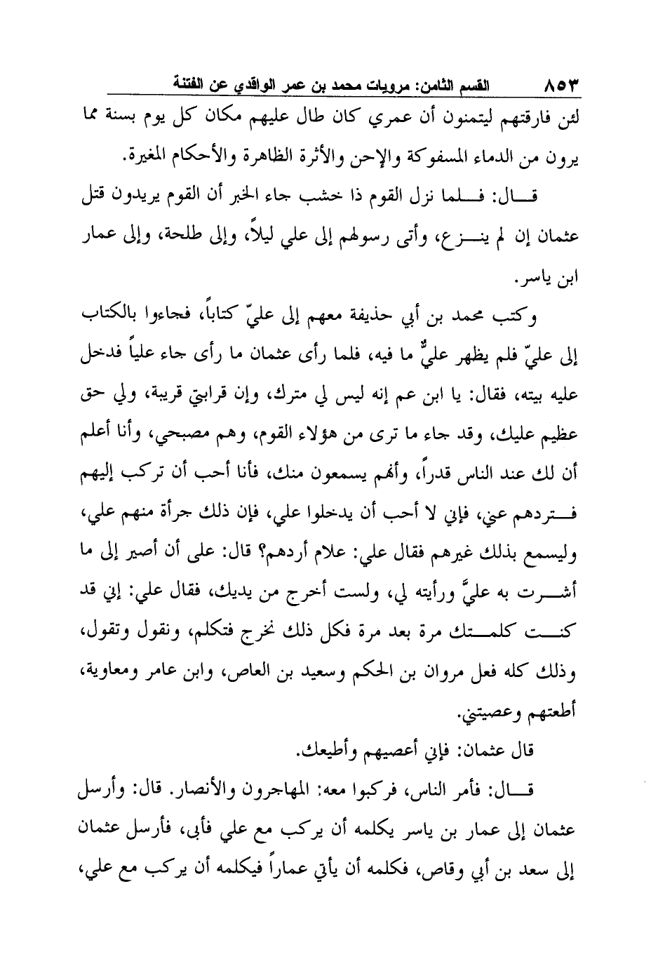 وكتب محمد بن أبي حذيفة معهم إلى عليّ كتاباً، فجاءوا بالكتاب إلى عليّ فلم يظهر عليٌّ ما فيه، فلما رأى عثمان ما رأى جاء علياً فدخل عليه بيته، فقال: يا ابن عم إنه ليس لي مترك، وإن قرابتي قريبة، ولي حق عظيم عليك، وقد جاء ما ترى من هؤلاء القوم، وهم مصبحي، وأنا أعلم أن لك عند الناس قدراً، وأنهم يسمعون منك، فأنا أحب أن تركب إليهم فتردهم عني، فإني لا أحب أن يدخلوا علي، فإن ذلك جرأة منهم علي، وليسمع بذلك غيرهم فقال علي: علام أردهم؟ قال: على أن أصير إلى ما أشرت به عليَّ ورأيته لي، ولست أخرج من يديك، فقال علي: إني قد كنت كلمتك مرة بعد مرة فكل ذلك نخرج فتكلم، ونقول وتقول، وذلك كله فعل مروان بن الحكم وسعيد بن العاص، وابن عامر ومعاوية، أطعتهم وعصيتني. قال عثمان: فإني أعصيهم وأطيعك. قال: فأمر الناس، فركبوا معه: المهاجرون والأنصار. قال: وأرسل عثمان إلى عمار بن ياسر يكلمه أن يركب مع علي فأبى، فأرسل عثمان إلى سعد بن أبي وقاص، فكلمه أن يأتي عماراً فيكلمه أن يركب مع علي،