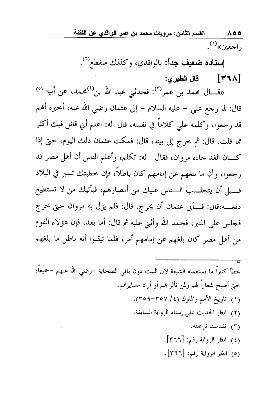 41- قال الطبري: "قال محمد بن عمر3: فحدثني عبد الله بن4 محمد، عن أبيه5 قال: لما رجع علي - عليه السلام - إلى عثمان رضي الله عنه، أخبره أنهم قد رجعوا، وكلمه علي كلاماً في نفسه، قال له: اعلم أني قائل فيك أكثر مما قلت. قال: ثم خرج إلى بيته، قال: فمكث عثمان ذلك اليوم، حتى إذا كان الغد جاءه مروان، فقال له: تكلم، وأعلم الناس أن أهل مصر قد رجعوا، وأن ما بلغهم عن إمامهم كان باطلاً، فإن خطبتك تسير في البلاد قبل أن يتحلب الناس عليك من أمصارهم، فيأتيك من لا تستطيع دفعه، قال: فأبى عثمان أن يخرج. قال: فلم يزل به مروان حتى خرج فجلس على المنبر، فحمد الله وأثنى عليه ثم قال: أما بعد، فإن هؤلاء القوم من أهل مصر كان بلغهم عن إمامهم أمر، فلما تيقنوا أنه باطل ما بلغهم