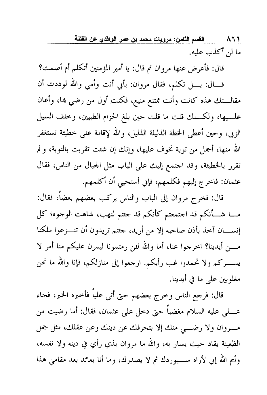 قال: بل تكلم، فقال مروان: بأبي أنت وأمي والله لوددت أن مقالتك هذه كانت وأنت ممتنع منيع، فكنت أول من رضي بها، وأعان عليها، ولكنك قلت ما قلت حين بلغ الحزام الطبيين، وخلف السيل الزبى، وحين أعطى الخطة الذليلة الذليل، والله لإقامة على خطيئة تستغفر الله منها، أجمل من توبة تخوف عليها، وإنك إن شئت تقربت بالتوبة، ولم تقرر بالخطيئة، وقد اجتمع إليك على الباب مثل الجبال من الناس، فقال عثمان: فاخرج إليهم فكلمهم، فإني أستحيي أن أكلمهم.