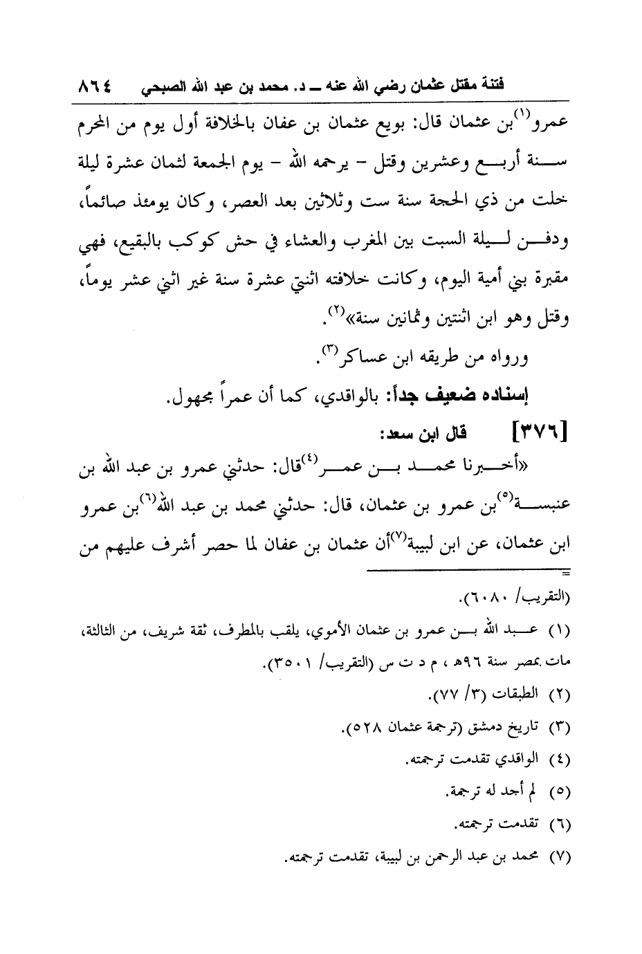 49- قال ابن سعد: "أخبرنا محمد بن عمر4 قال: حدثني عمرو بن عبد الله بن عنبسة5 بن عمرو بن عثمان، قال: حدثني محمد بن عبد الله6 بن عمرو ابن عثمان، عن ابن لبيبة7 أن عثمان بن عفان لما حصر أشرف عليهم من