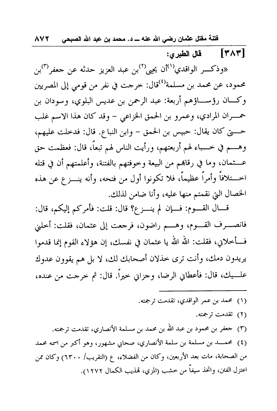 56- قال الطبري: "وذكر الواقدي1 أن يحيى2 بن عبد العزيز حدثه عن جعفر3 ابن محمود، عن محمد بن مسلمة4 قال: خرجت في نفر من قومي إلى المصريين وكان رؤساؤهم أربعة: عبد الرحمن بن عديس البلوي، وسودان ابن حمران المرادي، وعمرو بن الحمق الخزاعي - وقد كان هذا الاسم غلب حتى كان يقال: حبيس بن الحمق - وابن النباع. قال: فدخلت عليهم، وهم في خباء لهم أربعتهم، ورأيت الناس لهم تبعاً، قال: فعظمت حق عثمان، وما في رقابهم من البيعة وخوفتهم بالفتنة، وأعلمتهم أن في قتله اختلافاً وأمراً عظيماً، فلا تكونوا أول من فتحه، وأنه ينزع عن هذه الخصال التي نقمتم منها عليه، وأنا ضامن لذلك.