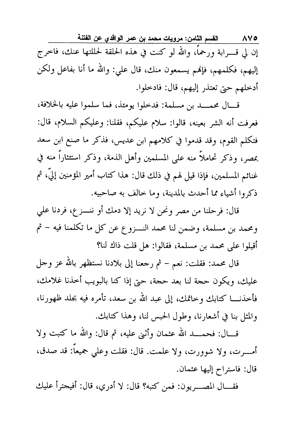 قال: فرحلنا من مصر ونحن لا نريد إلا دمك أو ننزع، فردنا علي ومحمد بن مسلمة، وضمن لنا محمد النزوع عن كل ما تكلمنا فيه - ثم أقبلوا على محمد بن مسلمة، فقالوا: هل قلت ذاك لنا؟