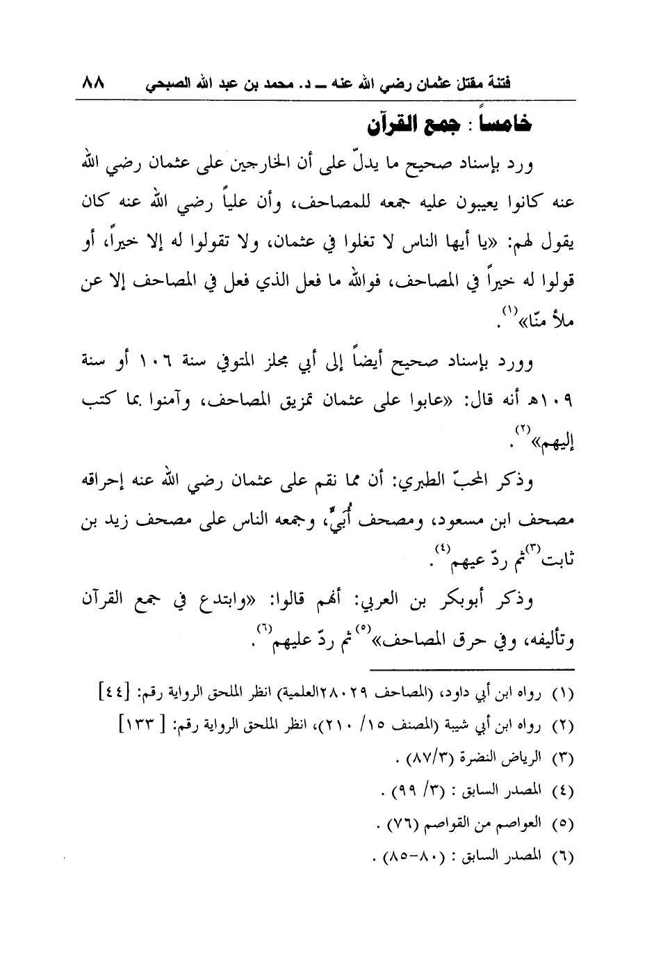 وذكر المحبّ الطبري: أن مما نقم على عثمان رضي الله عنه إحراقه مصحف ابن مسعود، ومصحف أُبَيٍّ، وجمعه الناس على مصحف زيد بن ثابت3ثم ردّ عيهم4.
