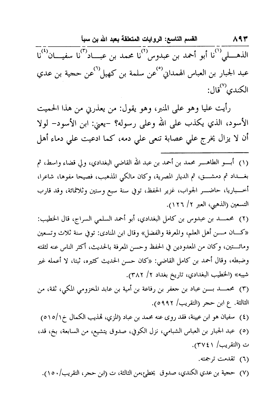 الذهلي1 نا أبو أحمد بن عبدوس2 نا محمد بن عباد3 نا سفيان4 نا عبد الجبار بن العباس الهمداني5 عن سلمة بن كهيل6 عن حُجَيَّة بن عدي الكندي7 قال: رأيت علياً وهو على المنبر، وهو يقول: من يعذرني من هذا الحميت الأسود، الذي يكذب على الله وعلى رسوله؟ -يعني: ابن الأسود- لولا أن لا يزال يخرج علي عصابة تنعى علي دمه، كما ادعيت علي دماء أهل