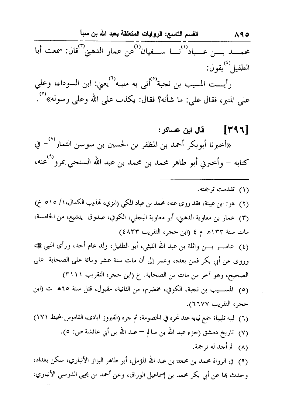 محمد بن عبّاد1 نا سفيان2 عن عمار الدُّهْني3 قال: سمعت أبا الطفيل4 يقول: رأيت المسيب بن نَجَبَة5أتى به مُلَبِّبَه6يعني: ابن السوداء، وعليُّ على المنبر، فقال علي: ما شأنه؟ فقال: يكذب على الله وعلى رسوله"7.