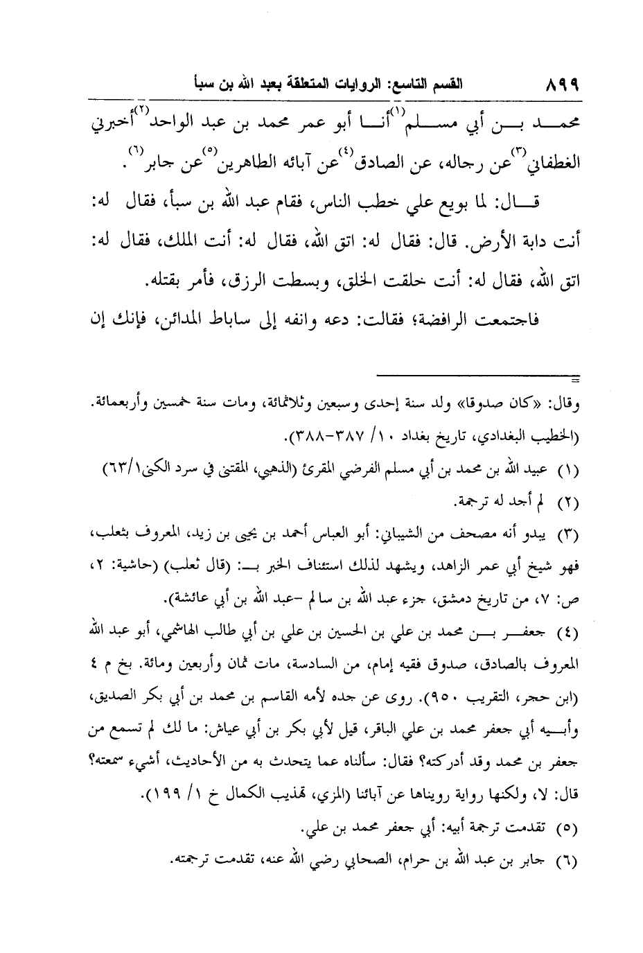 محمد بن أبي مسلم1 أنا أبو عمر محمد بن عبد الواحد2 أخبرني الغطفاني3 عن رجاله، عن الصادق4 عن آبائه الطاهرين5عن جابر6.قال: لما بويع علي خطب الناس، فقام عبد الله بن سبأ، فقال له: أنت دابة الأرض. قال: فقال له: اتق الله، فقال له: أنت الملك، فقال له: اتق الله، فقال له: أنت خلقت الخلق، وبسطت الرزق، فأمر بقتله. فاجتمعت الرافضة؛ فقالت: دعه وانفه إلى ساباط المدائن، فإنك إن