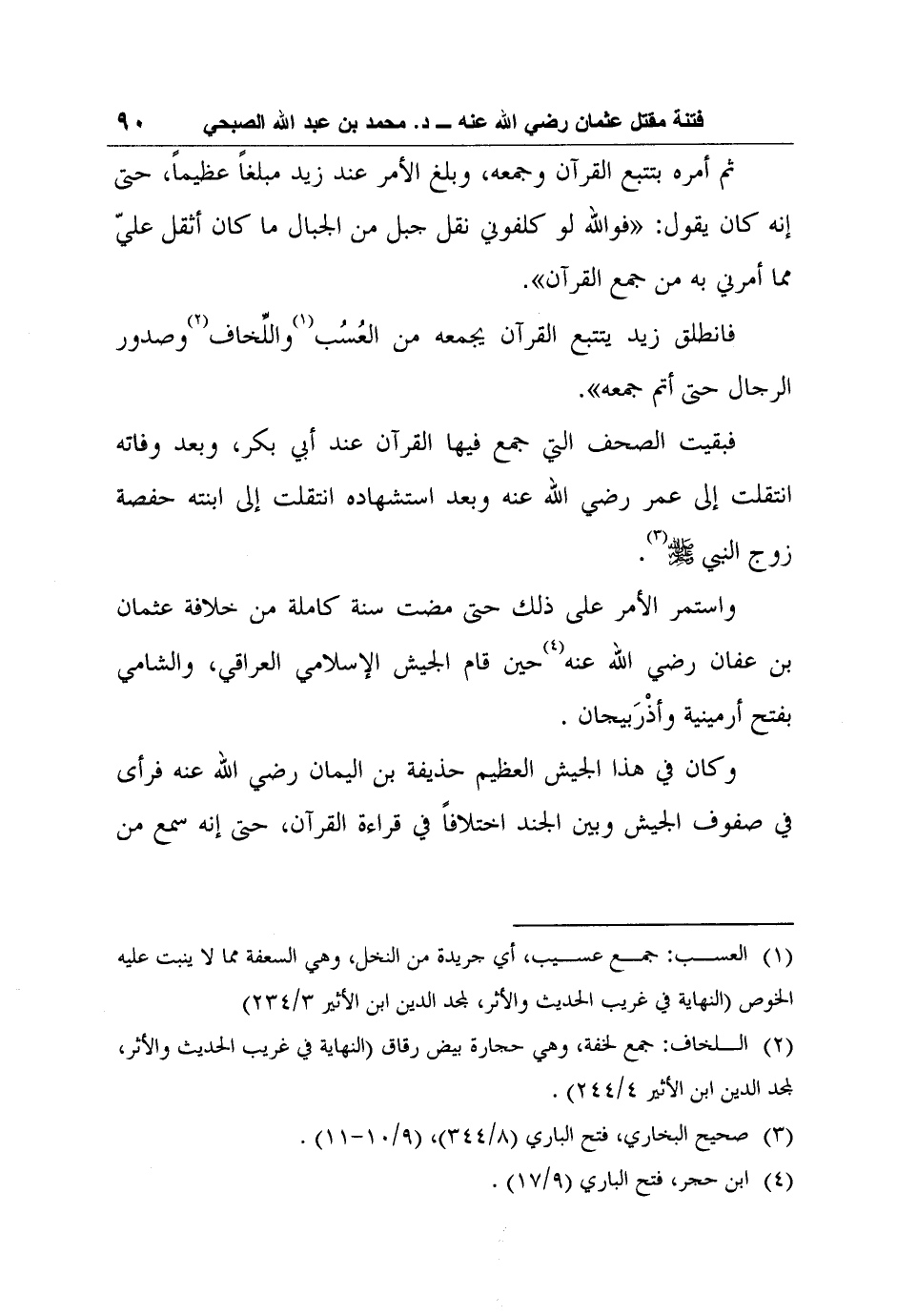 فانطلق زيد يتتبع القرآن يجمعه من العُسُب1 واللِّخاف2 وصدور الرجال حتى أتم جمعه".