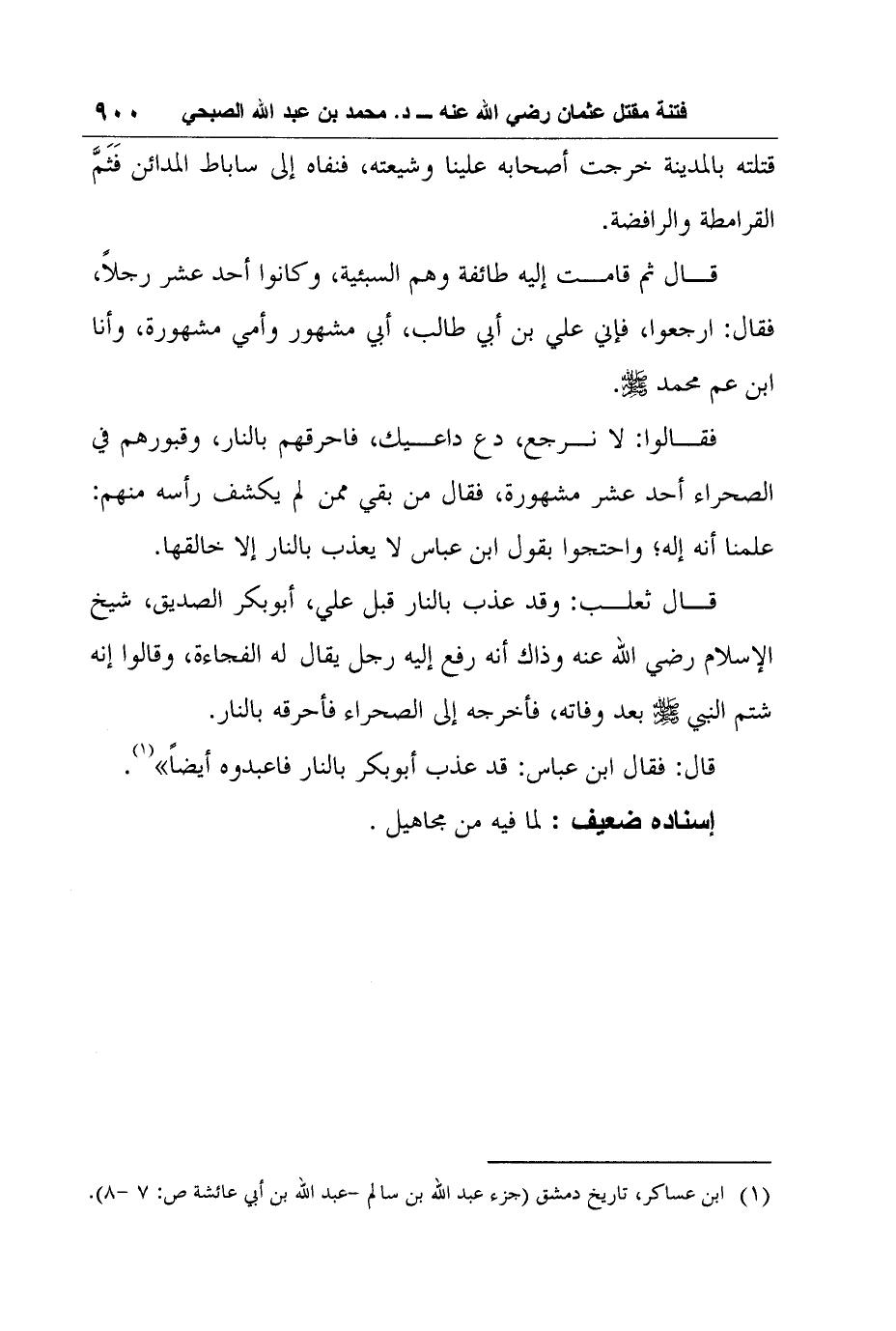 قتلته بالمدينة خرجت أصحابه علينا وشيعته، فنفاه إلى ساباط المدائن فَثَمَّ القرامطة والرافضة. قال ثم قامت إليه طائفة وهم السبأية، وكانوا أحد عشر رجلاً، فقال: ارجعوا، فإني علي بن أبي طالب، أبي مشهور وأمي مشهورة، وأنا ابن عم محمد صلى الله عليه وسلم. فقالوا: لا نرجع، دع داعيك، فاحرقهم بالنار، وقبورهم في الصحراء أحد عشر مشهورة، فقال من بقي ممن لم يكشف رأسه منهم: علمنا أنه إله؛ واحتجوا بقول ابن عباس لا يعذب بالنار إلا خالقها.