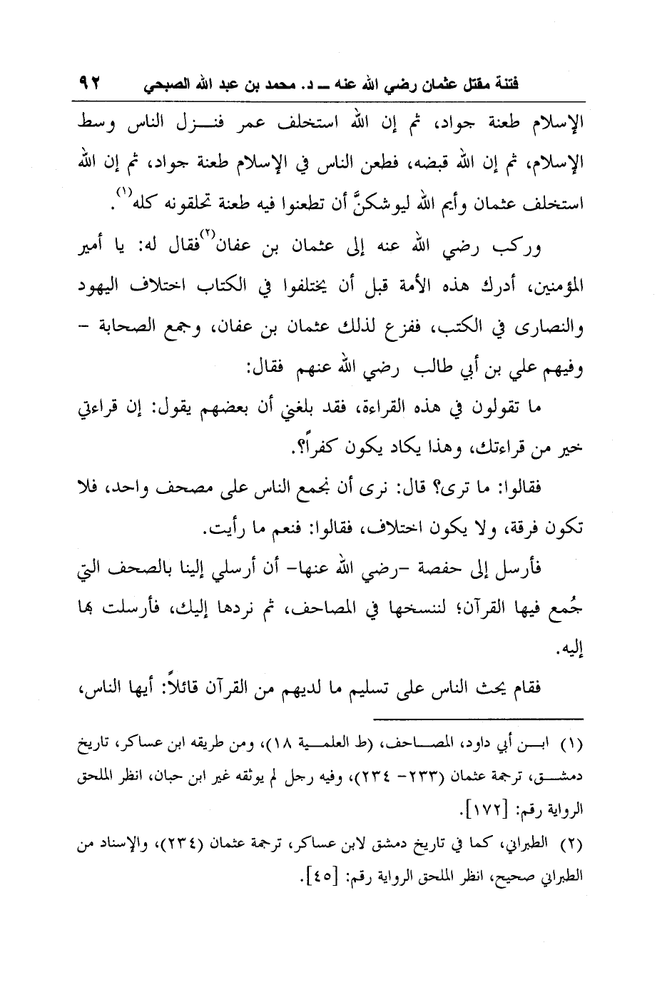 1 ابن أبي داود، المصاحف، (ط العلمية 18، ومن طريقه ابن عساكر، تاريخ دمشق، ترجمة عثمان (233- 234) ، وفيه رجل لم يوثقه غير ابن حبان، انظر الملحق الرواية رقم: [172] .