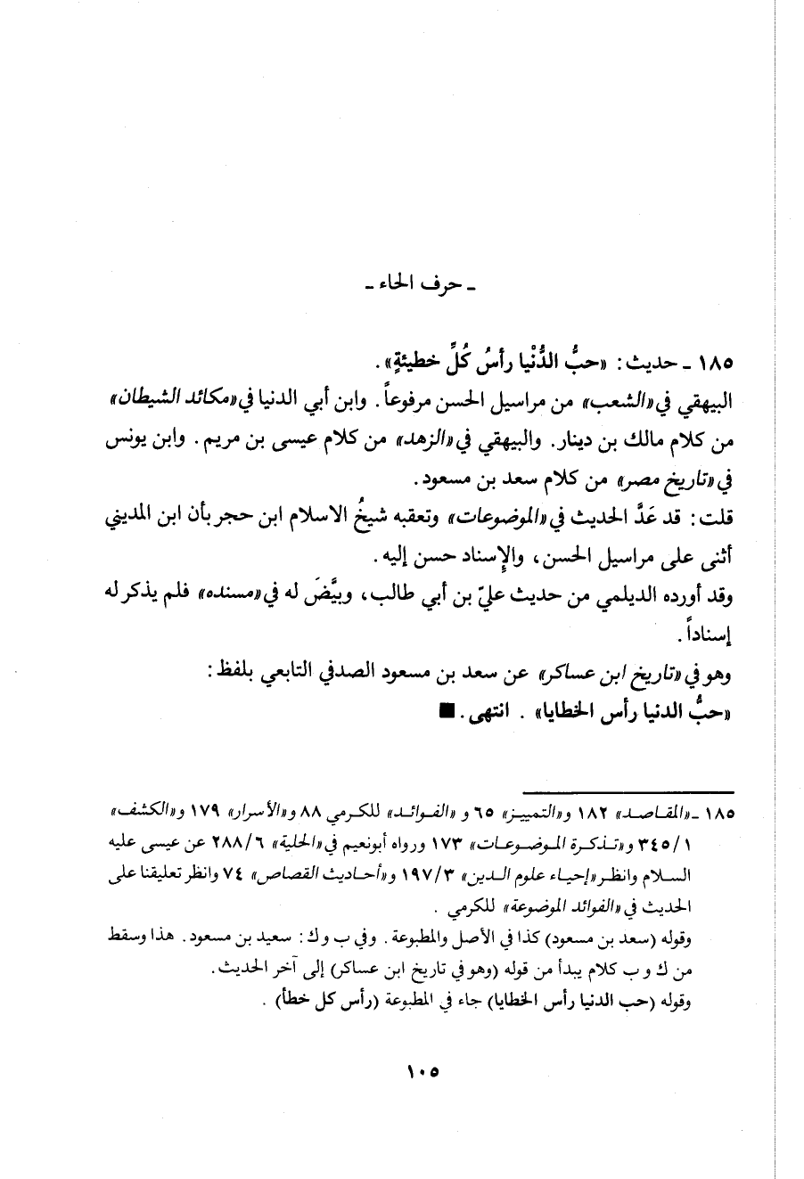 185 - (حديث) "حُبُّ الدُّنْيَا رَأْسُ كلِّ خَطِيئَةٍ" البيهقي في الشعب من مراسيل الحسن مرفوعاً، وابن أبي الدنيا في مكايد الشيطان من كلام مالك بن دينار، والبيهقي في الزهد من كلام عيسى ابن مريم، وابن يونس في تاريخ مصر من كلام سعد بن مسعود.