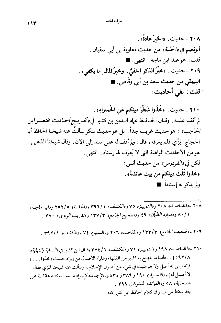 210 - (حديث) "خُذُوا شَطْرَ دِينِكُمْ عَنِ الْحُمَيْرَاءِ" لم أقف عليه. وقال الحافظ عماد الدين بن كثير في تخريج أحاديث مختصر ابن الحاجب هو حديث غريب جداً، بل هو حديث منكر، سألت عنه شيخنا الحافظ أبا الحجاج المزّي فلم يعرفه، قال: ولم أقف له على سند إلى الآن، وقال شيخنا الذهبي: هو من الأحاديث الواهية التي لا يعرف لها إسناد انتهى، لكن في الفردوس من حديث أنس: "خُذُوا ثُلُثَ دِينَكُمْ مِنْ بَيْتِ عَائِشَةَ" ولم يذكر له إسناداً.