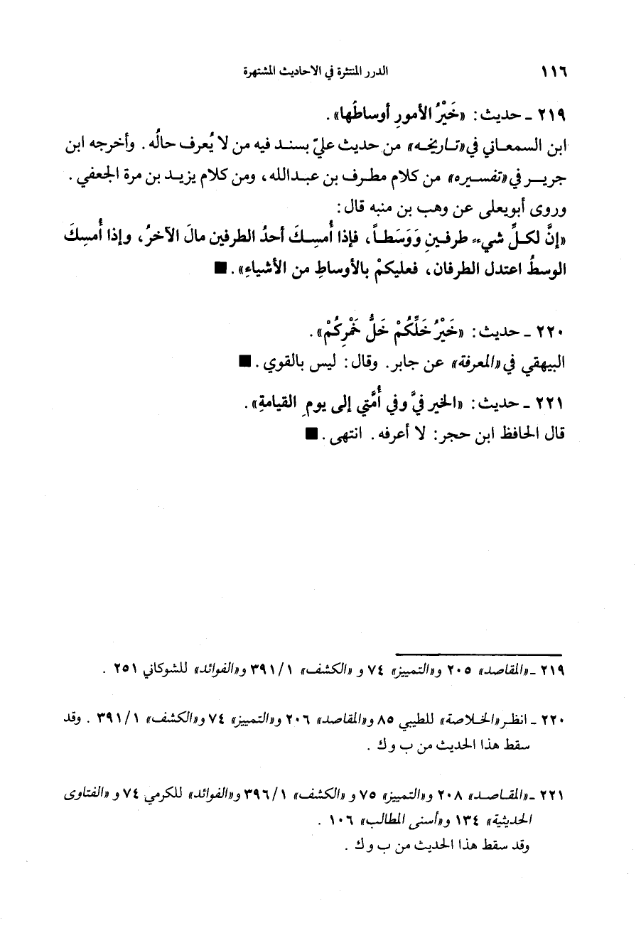 219 - (حديث) "خَيْرُ الأُمُورِ أَوْسَاطُهَا" ابن السمعاني في تاريخه من حديث عليّ بسند فيه من لا يعرف حاله. وأخرجه ابن جرير في تفسيره من كلام مطرّف بن عبد الله، ومن كلام يزيد بن مرة الجعفي. وروي أبو يعلى عن وهب بن منبه قال: "إِنَّ لِكُلِّ شَيْءٍ طَرَفَيْنِ وَوَسَطاً، فَإِذَا أُمْسِكَ أَحَدُ الطَّرَفَيْنَ مَالَ الآخَرُ، وَإذَا أُمْسِكَ الْوَسَطُ اعْتَدَلَ الطَّرَفَانِ، فَعَليْكُمْ بِالأَوْسَاطِ مِنَ الأَشْيَاء".