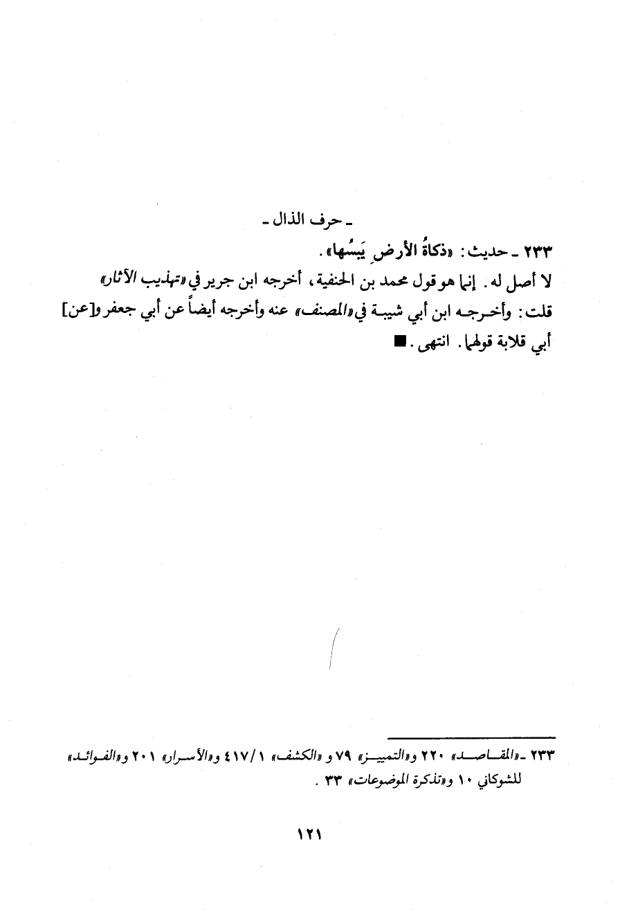 233 - (حديث) "ذَكَاةُ الأَرْضِ يُبْسُهَا" لا أصل له، إنما هو قول محمد بن الحنفية أخرجه ابن جرير في تهذيب الآثار.