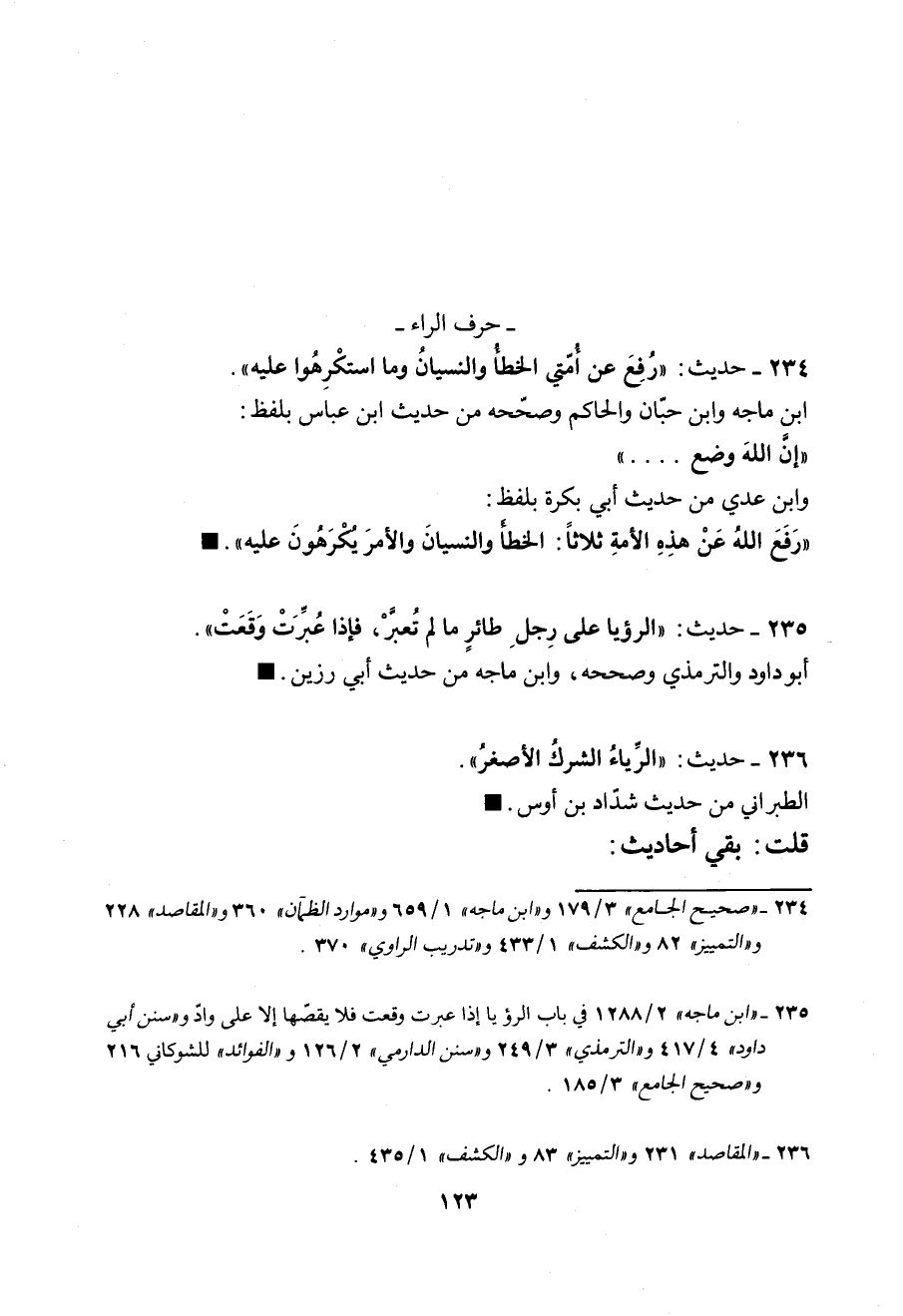 234 - (حديث) "رُفِعَ عَنْ أُمَّتِي الْخَطأُ وَالنِّسْيَانُ وَمَا اسْتُكرِهُوا عَلَيْهِ" ابن ماجه وابن حبان والحاكم وصححه من حديث ابن عباس بلفظ: "إِنَّ اللهَ وَضَعَ" وابن عديّ من حديث أبي بكرة بلفظ: "رَفَعَ اللهُ عَنْ هذِهِ الأُمَّةِ ثَلاَثاً: الْخَطَأَ، وَالنِّسْيَانَ، وَالأَمْرَ يُكْرَهُونَ عَلَيْهِ".