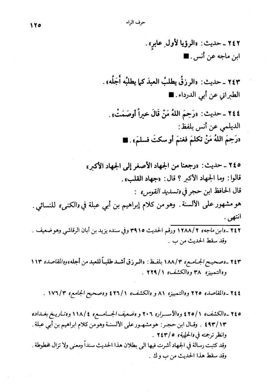 245 - (حديث) "رَجَعْنَا مِنَ الْجِهَادِ الأَصْغَرِ إِلَى الْجِهَادِ الأَكْبَرِ، قَالُوا وَمَا الْجِهَادُ الأَكْبَرُ؟ قَالَ جِهَادُ الْقَلْب" قال الحافظ بن حجر في تسديد القوس: هو مشهور عَلَى الألسنة، وهو من كلام إبراهيم بن أبي عبلة في السكنى للنسائي انتهى.