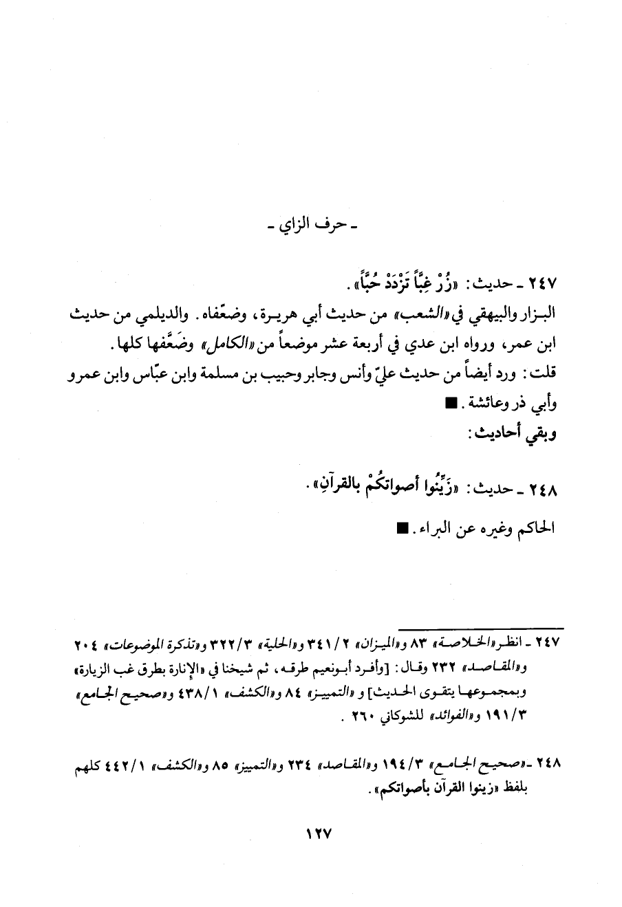 247 - (حديث) "زُرْ غِبّاً تَزْدَدْ حُبّاً" البزار والبيهقي في الشعب من حديث أبي هريرة وضعّفاه، والديلمي من حديث ابن عمر. ورواه ابن عديّ في أربعة عشر موضعاً من الكامل، وضعفها كلها.