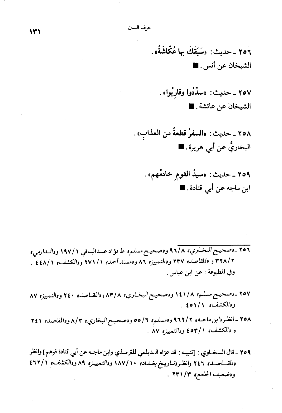 258 - (حديث) "السَّفَرُ قِطْعَةٌ مِنَ الْعَذَابِ" البخاري عن أبي هريرة رضي الله تعالى عنه.