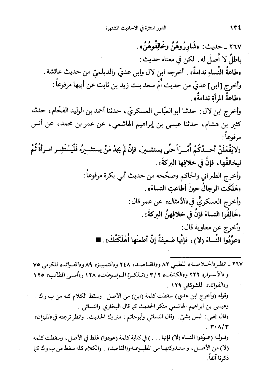 267 - (حديث) "شَاوِرُوهُنَّ وَخَالِفُوهُنَّ" باطل لا أصل له، لكن في معناه حديث: "طَاعَةُ النِّسَاءِ نَدَامَةٌ" أخرجه ابن لال وابن عديّ والديلمي من حديث عائشة. وأخرج ابن عدي من حديث أم سعد بنت زيد بن ثابت عن أبيها مرفوعاً: "طَاعَةُ المَرْأَةِ نَدَامَةٌ" وأخرج ابن لال: حدثنا أبو العباس العسكري، حدثنا أحمد بن الوليد الفحام، حدثنا كثير بن هشام، حدثنا عيسى بن إبراهيم الهاشمي، عن عمر بن محمد، عن أنس مرفوعاً: "لاَ يَفْعَلَنَّ أَحَدُكُمْ أَمَراً حَتَّى يَسْتَشِيرَ، فَإِنْ لَمْ يَجِدْ مَنْ يَسْتَشِيرُهُ فَلْيَسْتَشِرِ امْرَأَةً ثُمَّ لْيُخَالِفْهَا، فَإِنَّ فِي خِلاَفِهَا الْبَرَكَةَ" وأخرج الطبراني والحاكم وصححه من حديث أبي بكرة مرفوعاً: "هَلَكَتِ الرِّجَالُ حِينَ أَطَاعَتِ النِّسَاءَ" وأخرج العسكري في الأمثال عن عمر قال: "خَالِفُوا النِّسَاءِ فَإِنَّ في خِلاَفِهِنَّ الْبَرَكَةَ" وأخرج عن معاوية قال: "عُودُوا النِّسَاءِ فَإِنَّهَا ضَعِيفَةٌ، إِنْ أَطَعْتَهَا أَهْلَكْتكَ".