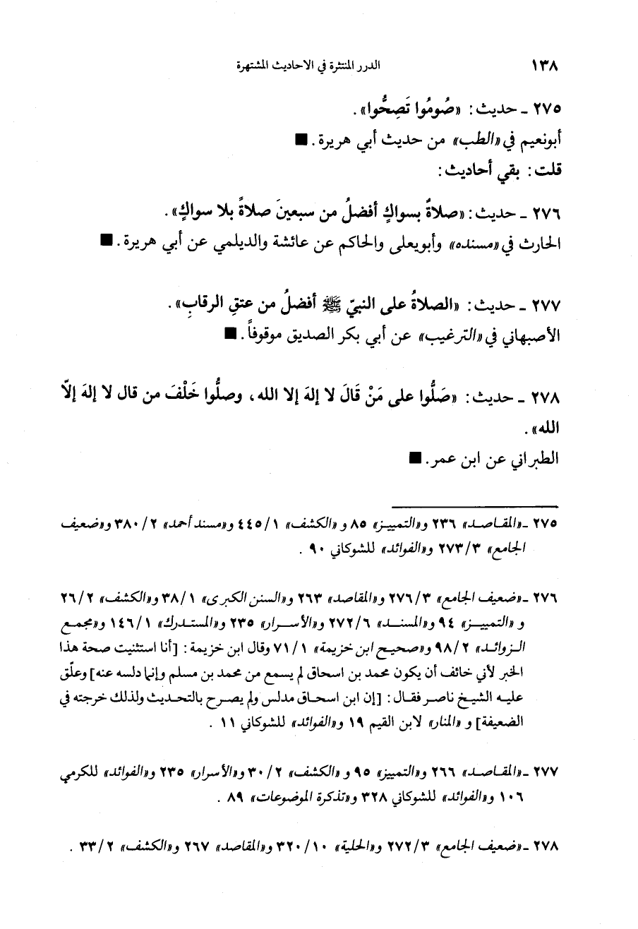276 - (حديث) "صَلاَةٌ بِسِوَاكٍ أَفْضَلُ مِنْ سَبْعِينَ صَلاَةً بِلاَ سِوَاكٍ" الحارث في مسنده، وأبو يعلى والحاكم عن عائشة، والديلمي عن أبي هريرة.