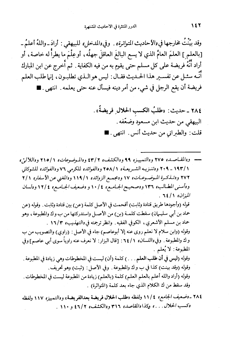 وقد بينت مخارجها في الأحاديث المتواترة، وفي المدخل للبيهقي: أراد والله أعلم بالعلم العلم العام الذي لا يسع البالغ العاقل جهله، وعلم ما يطرأ له خاصة، أو أراد به فريضة على كلّ مسلم حتى يقوم به من فيه الكفاية، ثم أخرج عن ابن المبارك أنه سئل عن تفسير هذا الحديث فقال: ليس هو الذي تطلبون، إنما طلب العلم فريضة أن يقع الرجل في شيء من أمر دينه فيسأل عنه حتى يعلمه، انتهى.