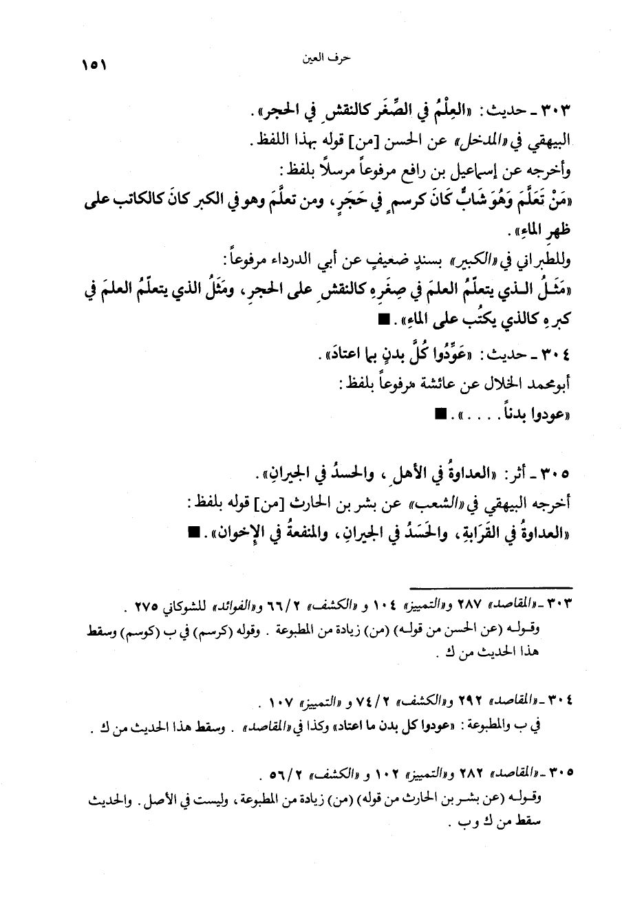 303 - (حديث) "الْعِلْمُ فِي الصِّغَرِ كالنَّقْشِ في الْحَجَر" البيهقي في المدخل عن الحسن من قوله بهذا اللفظ، وأخرجه عن إسماعيل بن رافع مرفوعاً مرسلاً بلفظ: "مَنْ تَعَلَّمَ وَهُوَ شَابٌّ كانَ كَرَسْمٍ فِي حَجَرٍ، وَمَنْ تَعَلَّمِ فِي الْكِبَرِ كانَ كالْكاتِبِ عَلَى ظَهْرِ المَاءِ" وللطبراني في الكبير بسند ضعيف عن أبي الدرداء مرفوعاً: "مَثَلُ الَّذي يَتَعلَّمُ الْعِلْمَ في صِغَرِهِ كالنَّقْشِ عَلَى الْحَجَرِ، وَمَثَلُ الَّذي يَتَعَلَّمُ الْعِلْمَ فِي كِبَرِه كالَّذِي يُكْتَبُ عَلَى المَاءِ".