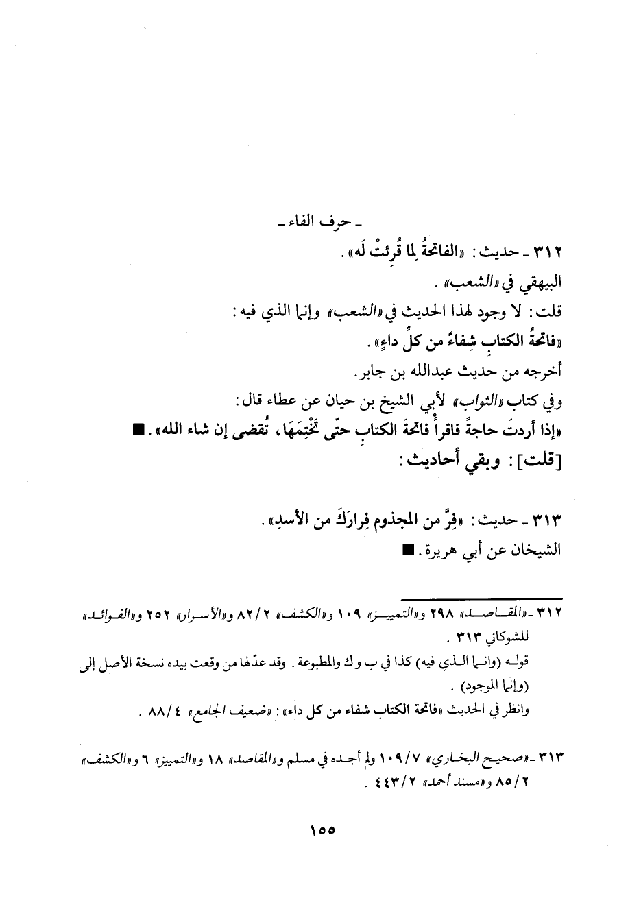 312 - (حديث) "الْفَاتِحَةُ لِمَا قُرِئَتْ لَهُ" البيهقي في الشعب.
