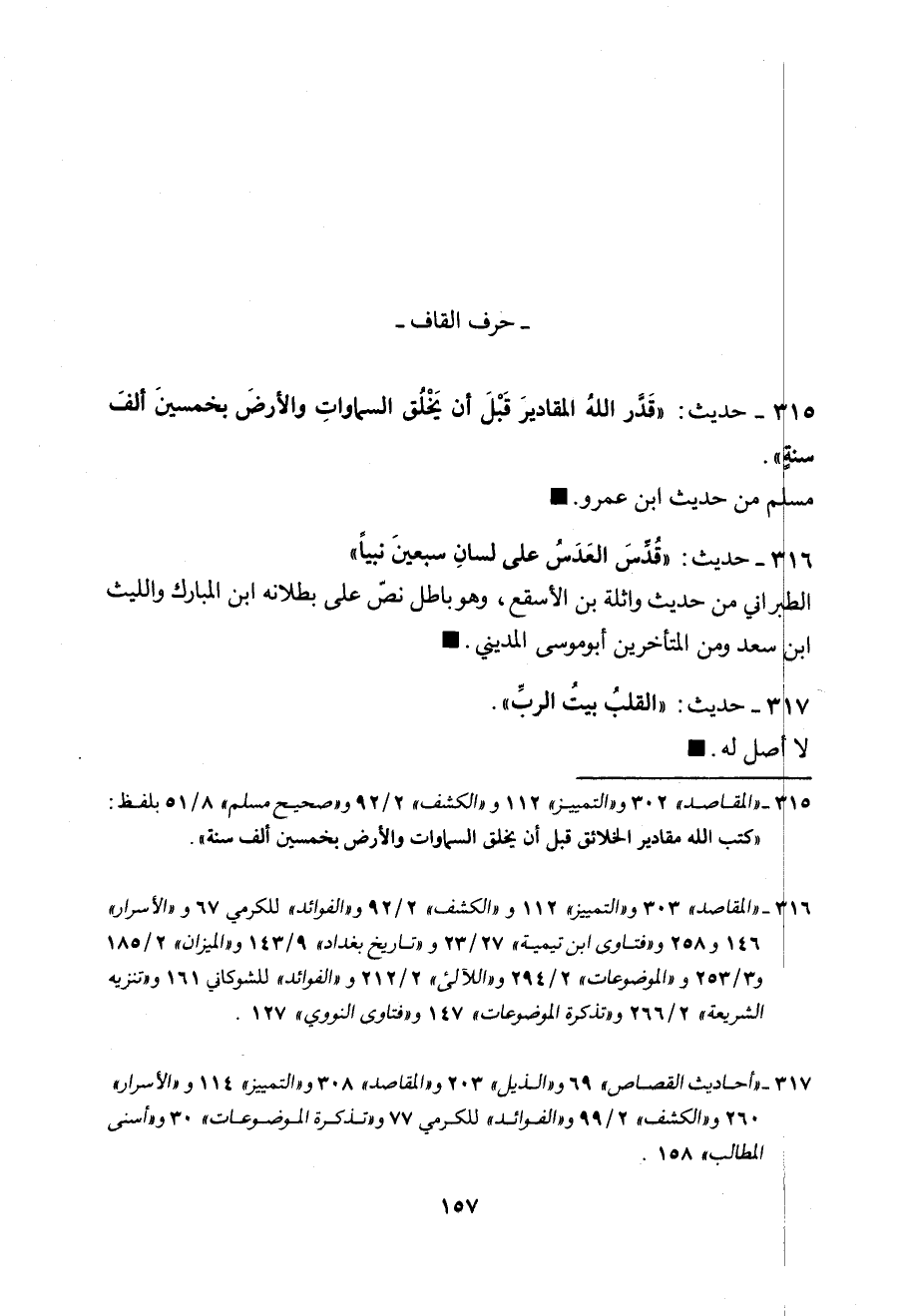 315 - (حديث) "قَدَّرَ اللهُ المَقَادِيرَ قَبْلَ أَنْ يَخْلُقَ السَّمَاواتِ (¬1) وَالأَرْضَ بِخَمْسِينَ أَلْفَ سَنَةٍ" مسلم من حديث ابن عمرو.