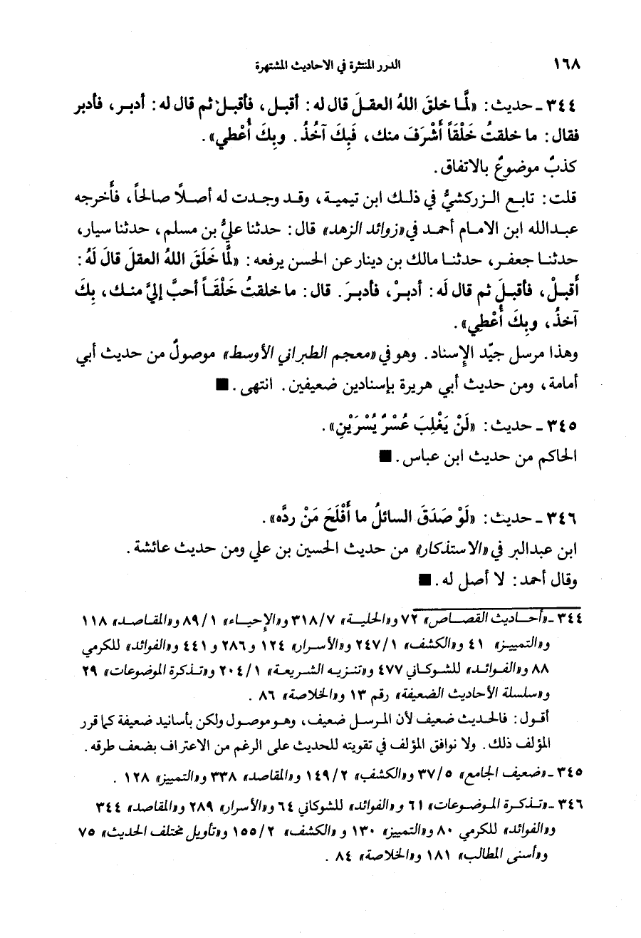 344 - (حديث) "لَمَّا خَلَقَ اللهُ الْعَقْلَ قالَ: أَقْبِلْ فَأَقْبَلَ، ثمَّ قَالَ لَهُ: أَدْبرْ فَأدْبَرَ، فَقَالَ: مَا خَلَقْتُ خَلْقاً أَشْرَفَ مِنْكَ، فَبِكَ آخُذُ، وبِكَ أٌعْطِي" كذب موضوع بالاتفاق.
