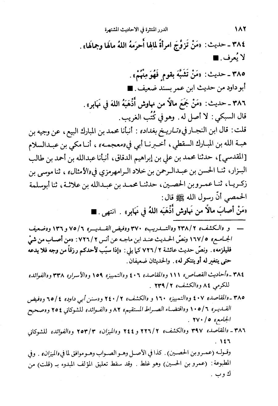 386 - (حديث) "مَنْ جَمَعَ مَالاً مِنْ نَهَاوِشَ أّذْهَبَهُ اللَّهُ في نَهَابِرَ" قال السبكي: لا أصل له، وهو في كتب الغريب.