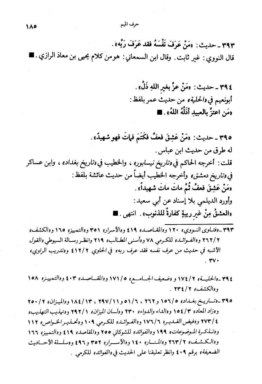393 - (حديث) "مَنْ عَرَفَ نَفْسَهُ فَقَدْ عَرَفَ رَبَّهُ" قال النووي: غير ثابت، وقال ابن السمعاني: هو من كلام يحيى بن معاذ الرازي رضي الله عنه.