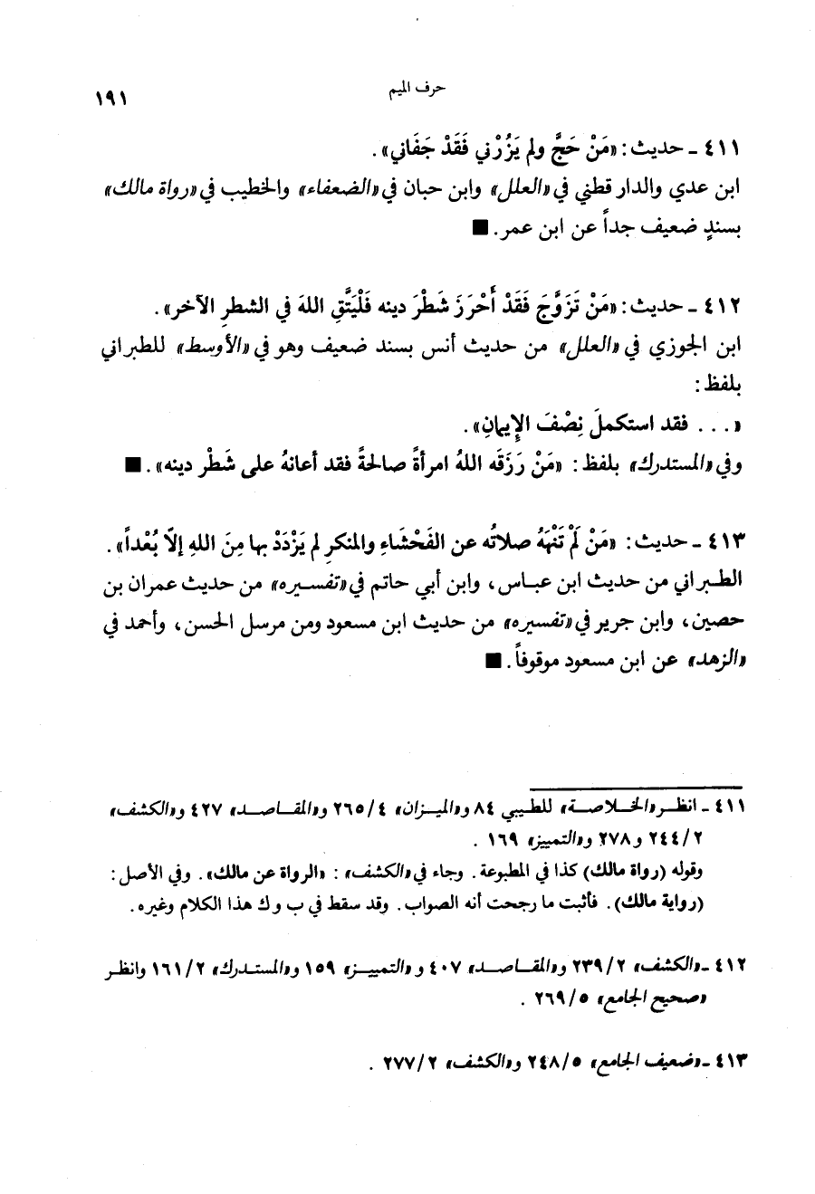 411 - (حديث) "مَنْ حَجَّ وَلَمْ يَزُرْنِي فَقَدْ جَفَانِي" ابن عدي والدارقطني في العلل، وابن حبان في الضعفاء، والخطيب في رواة مالك بسند ضعيف جداً عن ابن عمر.