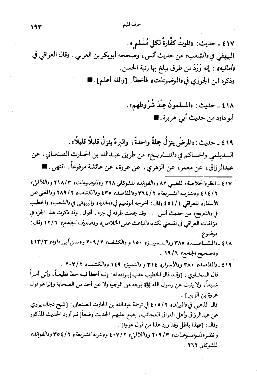 417 - (حديث) "الْمَوْتُ كَفَّارَةٌ لِكُلِّ مُسْلِمٍ" البيهقي في الشعب من حديث أنس، وصححه أبو بكر بن العربي. وقال العراقي في أماليه: إنه ورد من طريق يبلغ بها رتبة الحسن. وذكره ابن الجوزي في الموضوعات فأخطأ، والله أعلم.