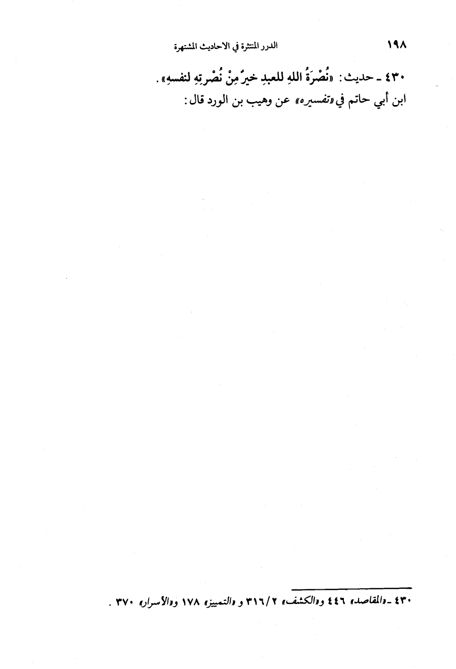 430 - (حديث) "نُصْرَةُ اللَّهِ لِلْعَبْدِ خَيْرٌ مِنْ نُصْرَتِهِ لِنَفْسِهِ" ابن أبي حاتم في تفسيره عن وهب بن الورد قال: "يَقُولُ اللَّهُ: ابْنَ آدَمَ إِذَا ظُلِمْتَ فَاصْبِرَ وَارْضَ بِنُصْرَتِي، فَإِنَّ نُصْرَتِي لَكَ خَيْرٌ مِنْ نُصْرَتِكَ لِنَفْسِكَ" وأخرجه عبد الله بن أحمد في زوائد الزهد عنه قال: بلغني أنه مكتوب في التوراة فذكره.