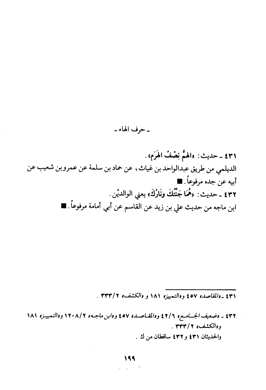 432 - (حديث) "هُمَا جَنَّتُكَ وَنَارُكَ، يَعْنِي الْوَالدِيْنِ" ابن ماجه من حديث عليّ بن زيد عن القاسم عن أبي أمامة مرفوعاً.
