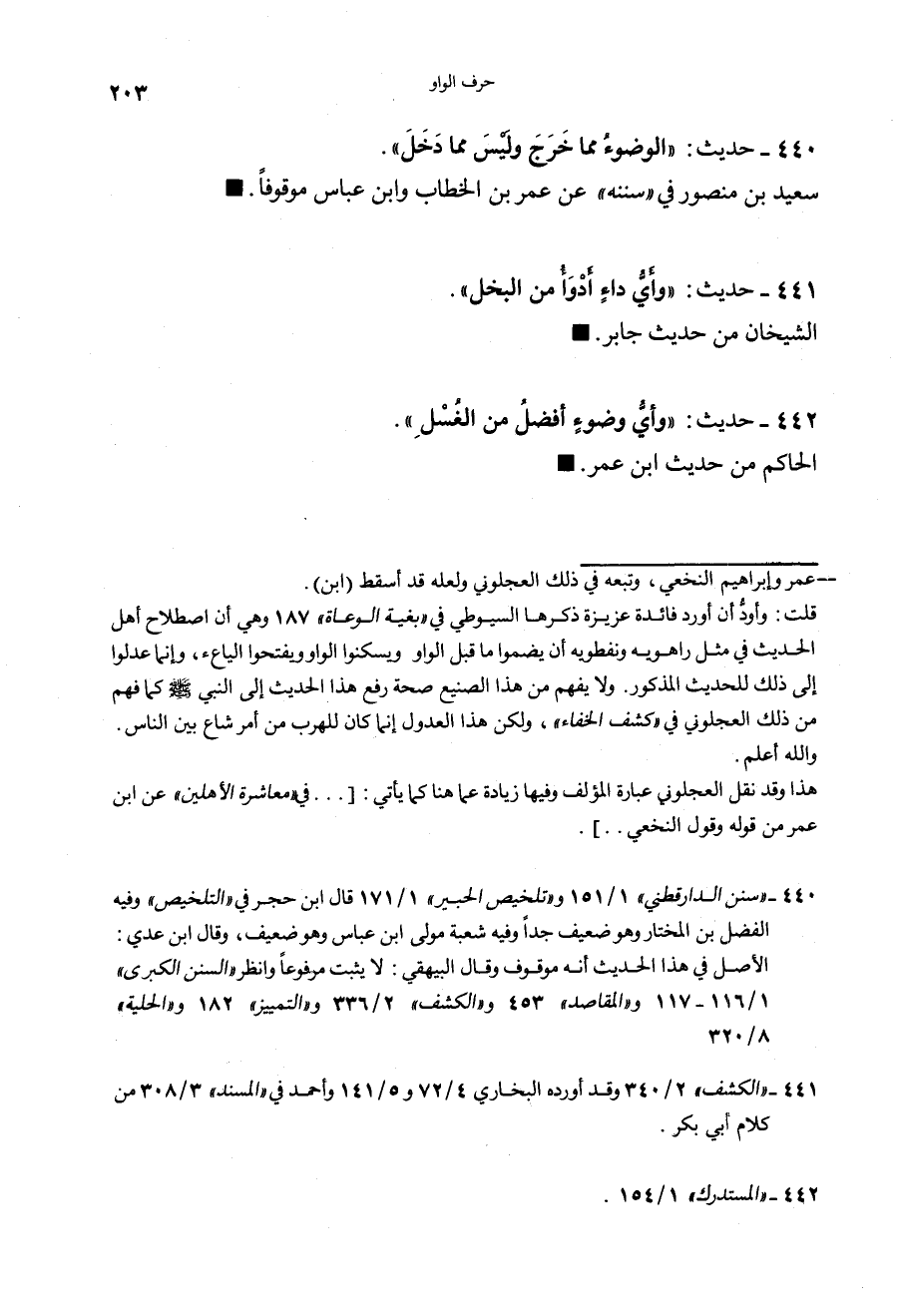440 - (حديث) "الْوَضَوءَ مِمَّا خَرَجَ وَلَيْسَ مَمَّا دَخَلَ" سعيد بن منصور في سننه عن عمر بن الخطاب وابن عباس موقوفاً.