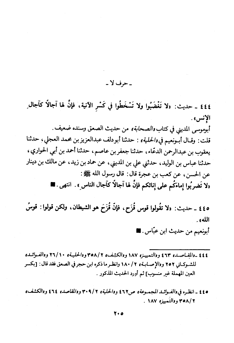 444 - (حديث) "لاَ تَغْضَبُوا، وَلاَ تَسْخَطُوا في كَسْرِ الآنيَةِ، فَإِنَّ لَهَا آجَالاً كَآجَالِ الإنْسِ" أبو موسى المديني في كتاب الصحابة من حديث الصعق وسنده ضعيف.