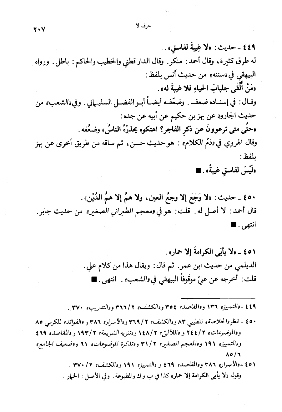 449 - (حديث) "لاَ غِيبَةَ لِفَاسِقٍ" له طرق كثيرة وقال أحمد منكر. وقال الدارقطني والخطيب والحاكم باطل، ورواه البيهقي في سننه من حديث أنس بلفظ: "مَنْ أَلْقَى جِلْبَابَ الْحَياءِ فَلاَ غِيبَةَ لَهُ" وقال في إسناده ضعف، وضعفه أيضاً أبو الفضل السليماني. وفي الشعب من حديث الجارود عن بهز بن حكيم عن أبيه عن جده: "حَتَّى مَتَى تَرْعَوُونَ عَنْ ذِكْرِ الْفَاجِرِ، هَتِّكُوهُ يَحْذَرْهُ النَّاسُ" وضعفه. وقال الهروي في ذم الكلام: هو حديث حسن، ثم ساقه من طرق أخرى عن بهز بلفظ: "لَيْس لِفَاسِقٍ غِيبَةٌ".
