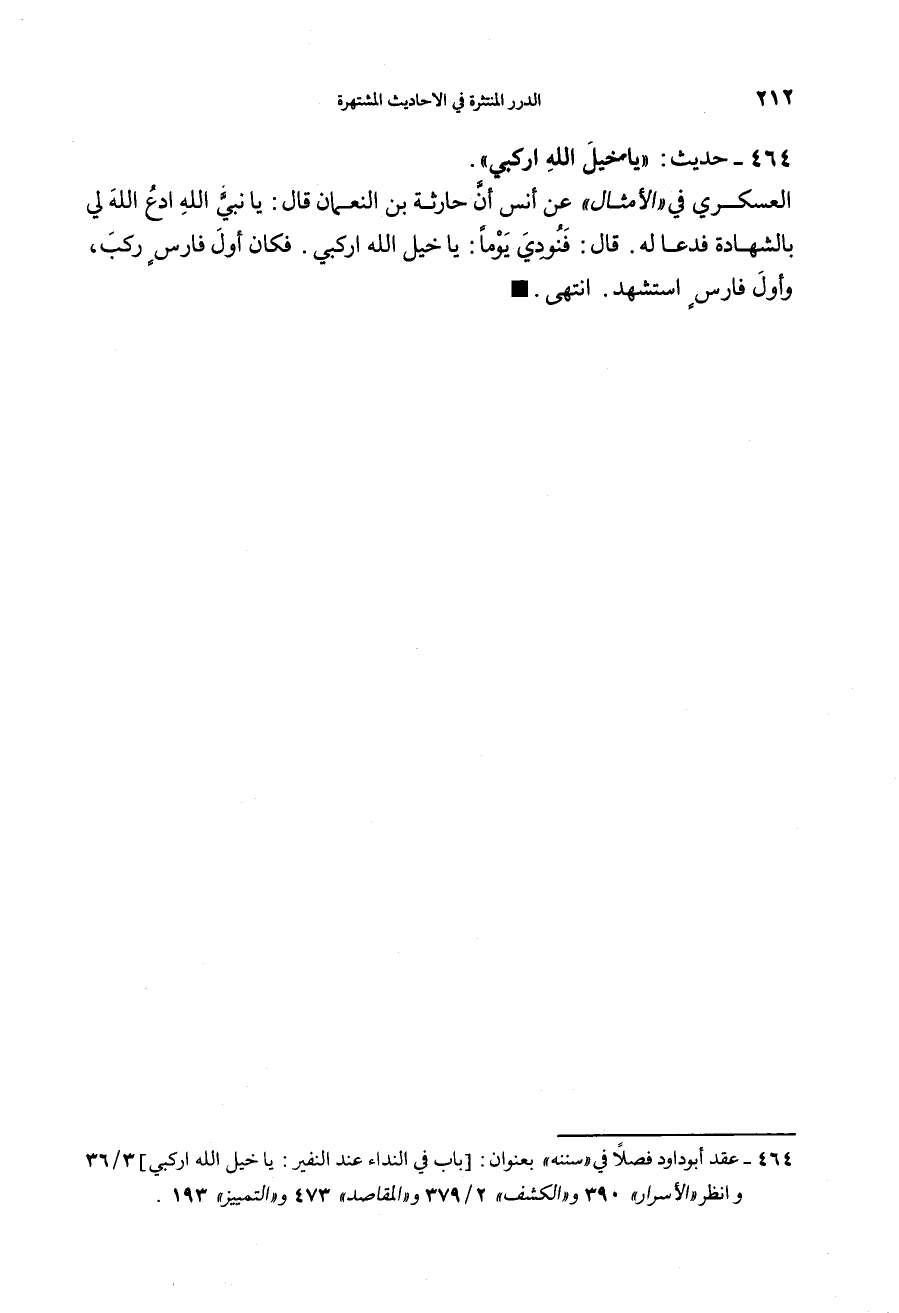 464 - حديث: "يَا خَيْلَ اللهِ ارْكَبي" العسكري في الأمثال عن أنس: أن حارثة بن النعمان قال: يا نبي الله ادع الله لي بالشهادة، فدعا له، قال: فنودي يوماً: "يا خيل الله اركبي" فكان أول فارس ركب، وأول فارس استشهد.