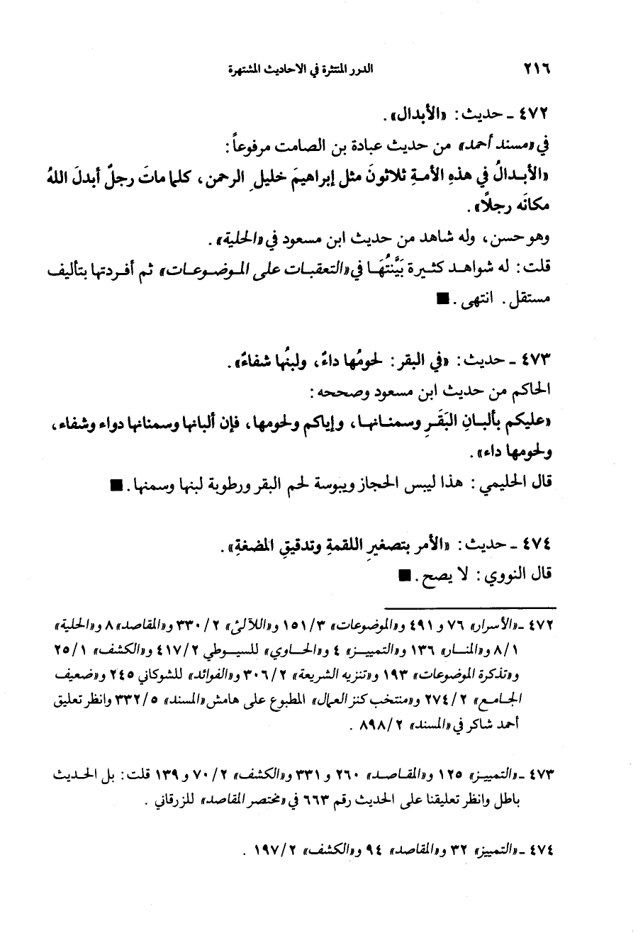 473 - (حديث) في البقر: "لُحُومُها دَاءٌ، وَلَبَنُهَا شِفَاءٌ" الحاكم من حديث ابن مسعود وصححه: "عَلَيْكُمْ بِأَلْبَانِ الْبَقَرِ وَأَسْمَانِهَا، وَإِيَّاكُمْ وَلُحُومَهَا، فَإِنَّ أَلْبَانَهَا وَأَسْمَانَهَا دَوَاءٌ وَشِفَاءٌ، وَلُحُومَهَا دَاءٌ" قال الحليمي: هذا لِيُبْسِ الْحجاز ويُبُوسة لحم البقر، ورطوبة لبنها وسمنها.