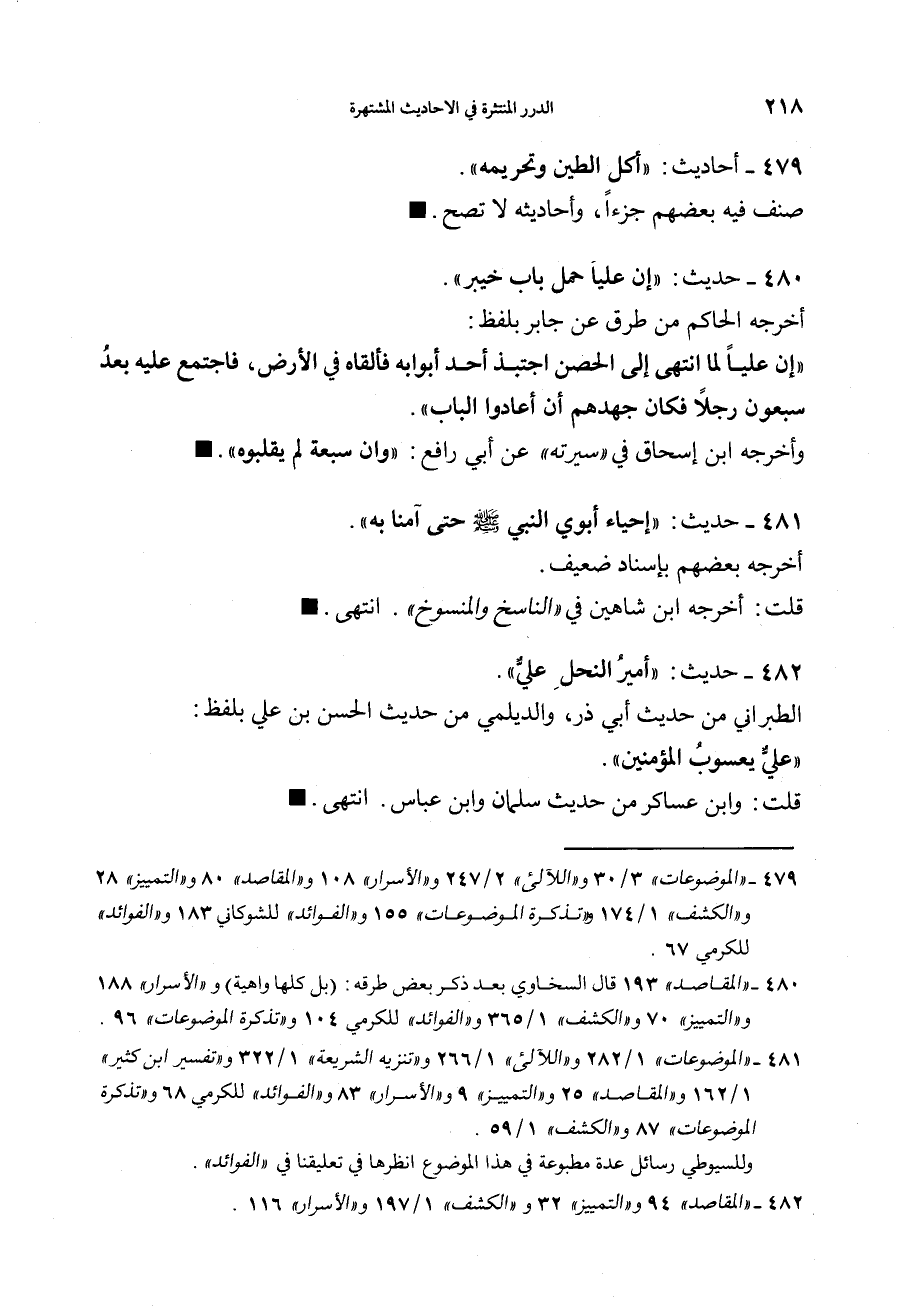 480 - (حديث) "إِنَّ عَلِيّاً حَمَلَ بَابَ خَيْبَرَ" أخرجه الحاكم من طرق عن جابر بلفظ: "إِنَّ عَلِيّاً لَمَّا انْتَهَى إِلَى الْحِصْنِ اجْتَذَبَ أَحَدَ أَبْوَابِهِ فَألْقَاهُ بِالأَرْضِ فَاجْتَمَعَ عَلَيْهِ بَعْدُ سَبْعُونَ رَجُلاً فَكانَ جُهْدُهُمْ أَنْ أَعَادُوا الْبَابَ".