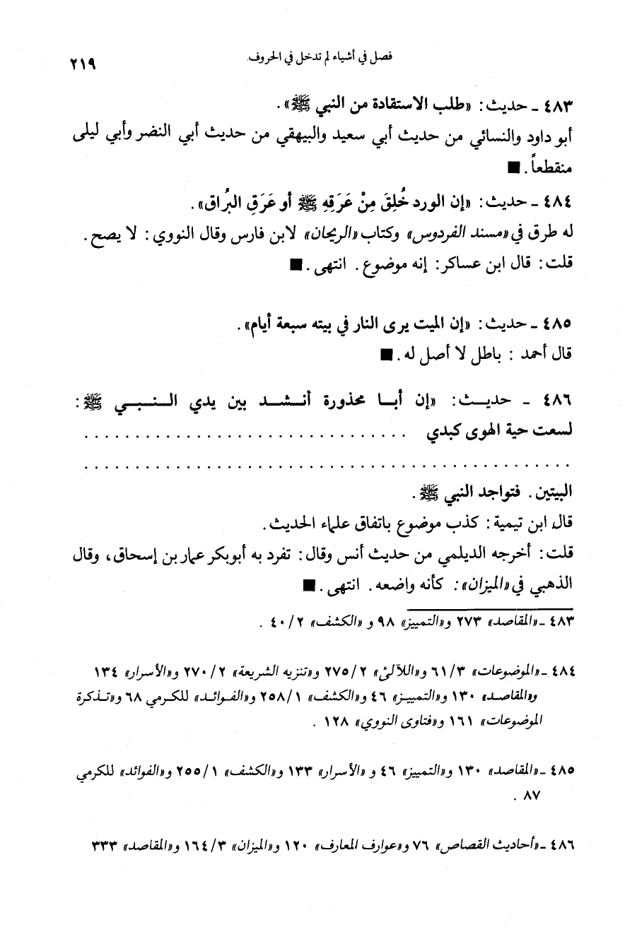 485 - (حديث) "إِنَّ المَيِّتَ يَرَى النَّارَ في بَيْتِهِ سَبْعَةَ أَيَّامٍ" قال أحمد رضي الله عنه: باطل لا أصل له.